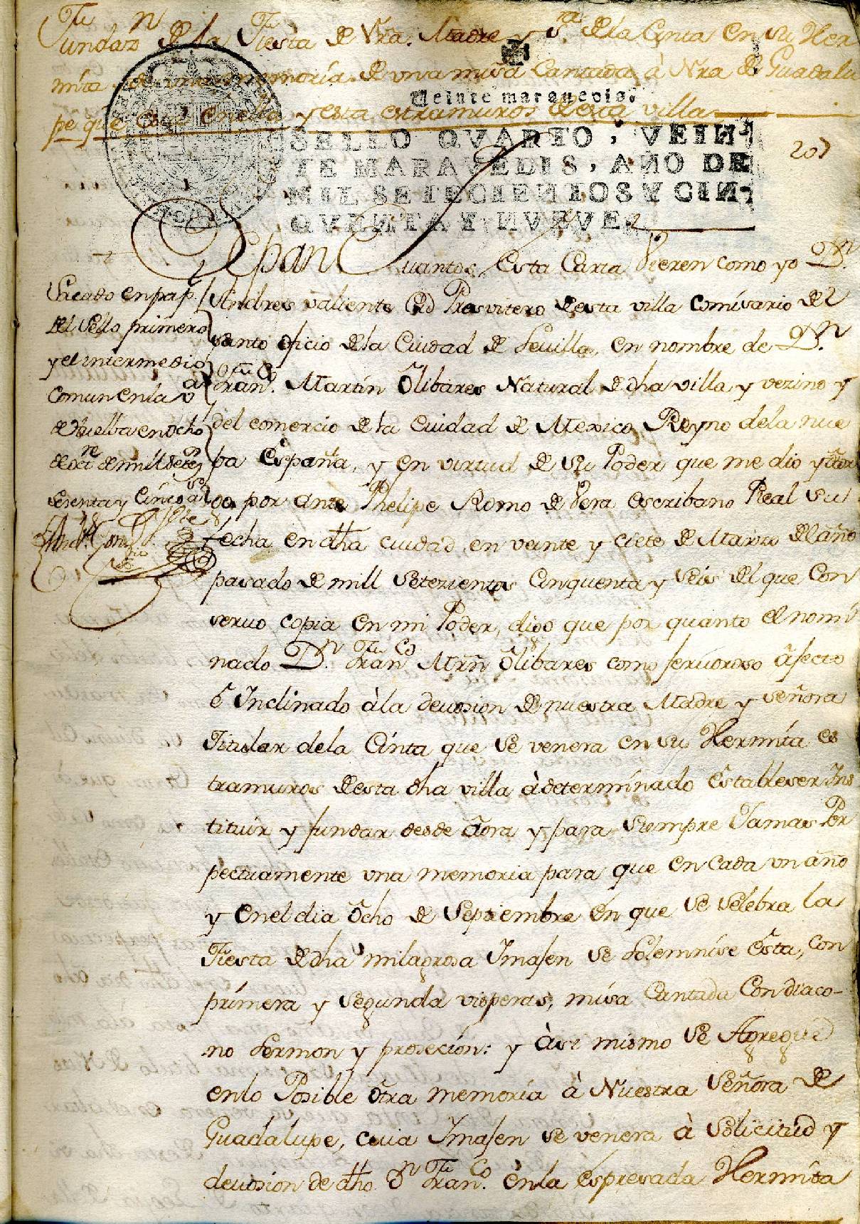 | Fundación de la Fiesta a Ntra. Sra. de la Cinta, en su ermita, y de una Memoria de misas cantadas a Ntra. Sra. de Guadalupe. 30 de Agosto de 1759. AHPH. Protocolos notariales, signatura 04260, fol. 207. |