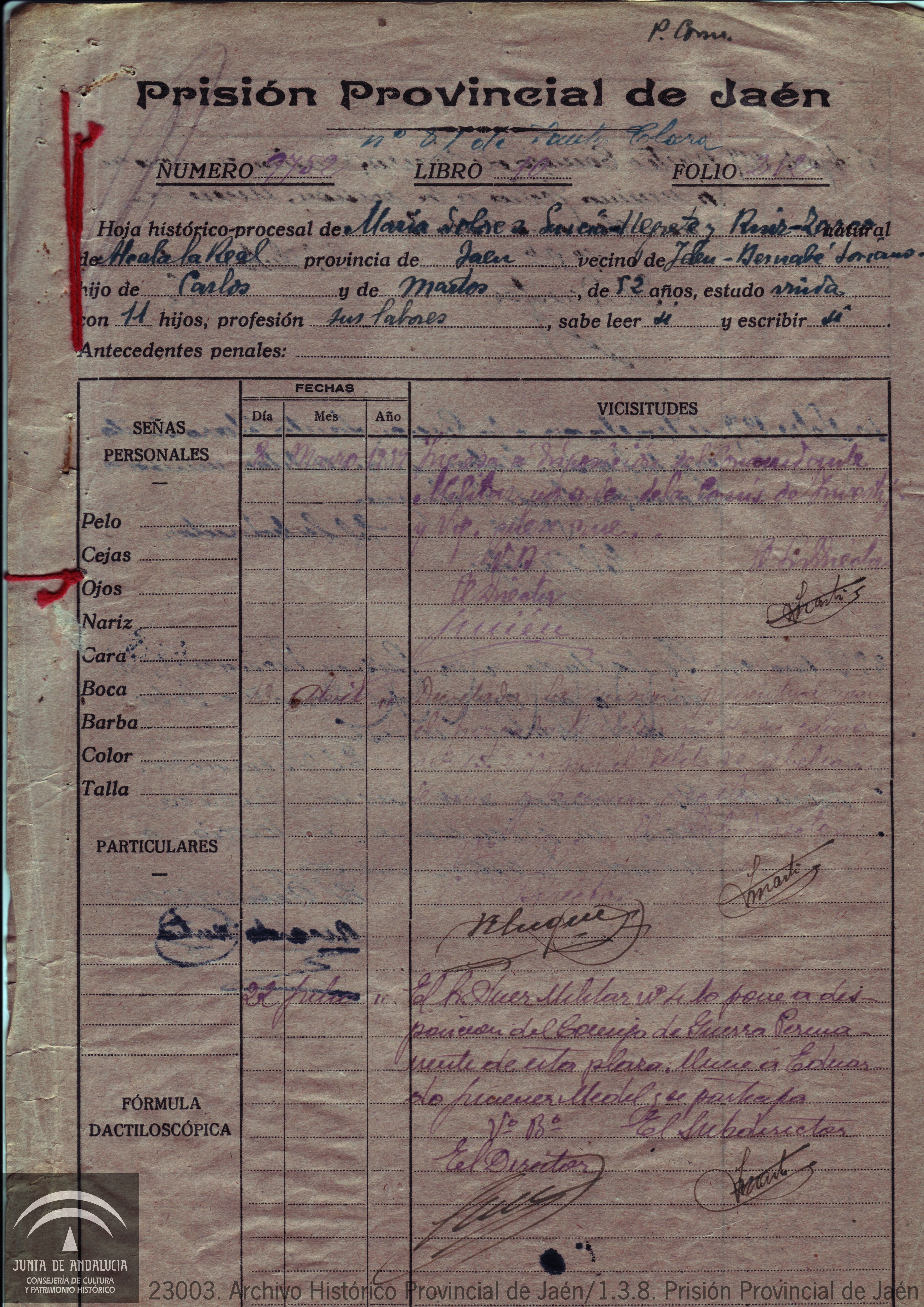 Documento 5. Expediente procesal de la Prisión Provincial de Jaén de Dolores García-Negrete. Dolores, que era natural de Alcalá la Real estuvo casada con Federico Castillo Extremera, que fue responsable provincial de Izquierda Republicana, diputado a cortes por Jaén y presidente de la Diputación Provincial de Jaén hasta que falleció en 1936. Tras la muerte de su marido y el inicio de la Guerra Civil y continuando la labor de éste, desarrolló una intensa actividad política: se afilió al Partido Comunista y fundó la Asociación de Mujeres Antifascistas para potenciar el papel de la mujer en la guerra. Al final de la Guerra, el 8 de marzo de 1939, Dolores García-Negrete y dos de sus hijos fueron encarcelados. El 22 de julio del mismo año pasa a disposición de la autoridad militar y tras Consejo de Guerra fue condenada a muerte en 1940.