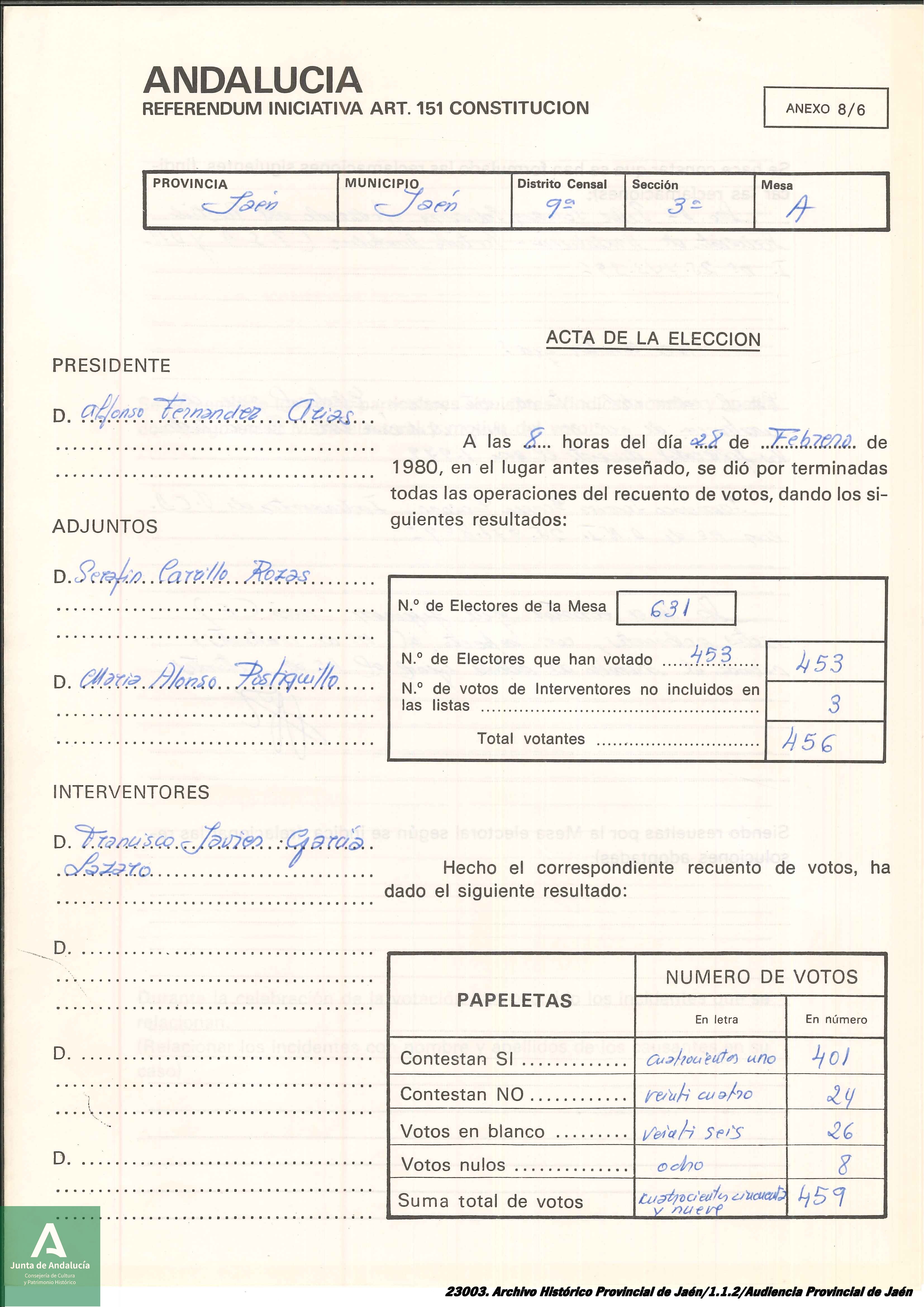 Respecto a este, hecho vamos a mostrar la certificación del escrutinio de una mesa electoral de Jaén en la que se puede apreciar los resultados del Referéndum, obteniendo el SÍ a la Autonomía una aplastante mayoría, 401 votos frente a los 24 votos del NO.