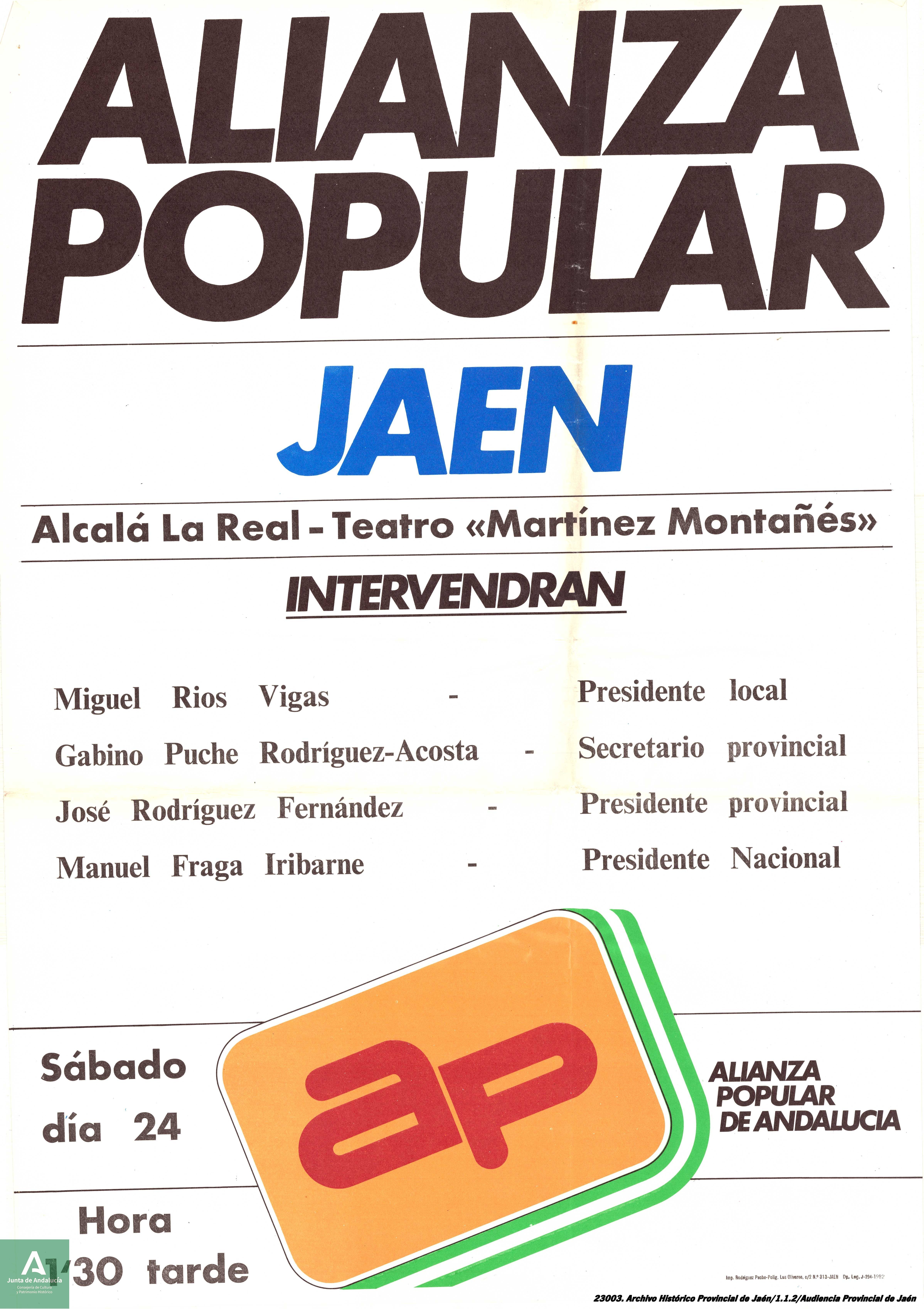 - Documento 6. Cartel de acto público de Alianza Popular el Alcalá la Real con asistencia de Manuel Fraga entre otros (JPG 3.08 MB)
