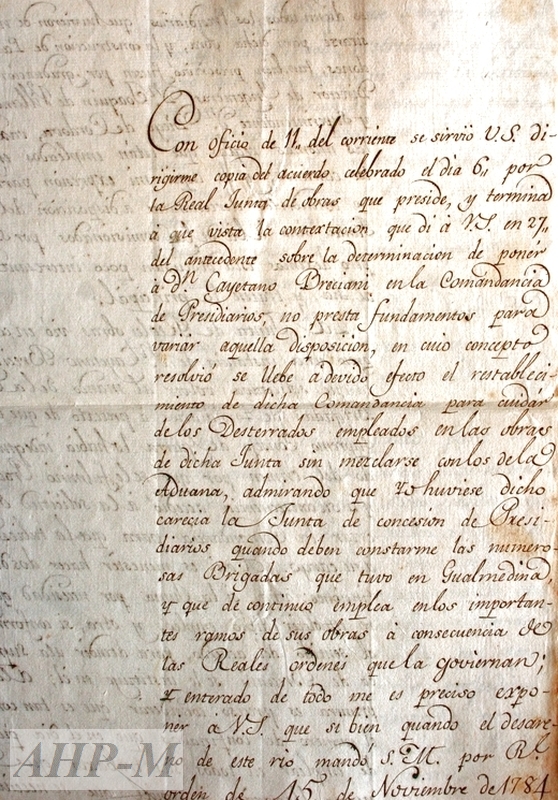 1797, octubre, 26. Málaga. Archivo Histórico Provincial de Málaga. Sección Fomento. Sig. 26825. José de Velasco Dueñas, responsable de las obras del puerto de Málaga, manifiesta a Rafael Vasco, Presidente de la Real Junta de Obras, su desacuerdo sobre el nombramiento de Cayetano Breciani para la Comandancia de Presidiarios. Oficio. Observ.: los presidiaros constituyeron la mano de obra la para la construcción del puerto de Málaga. ECB.
