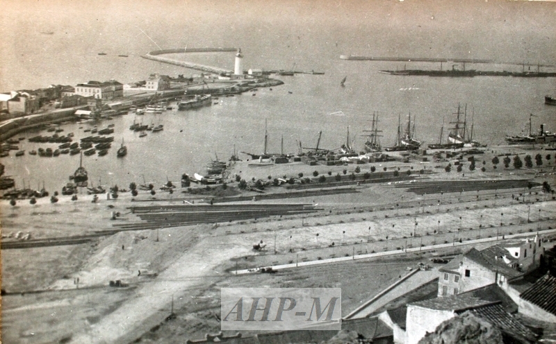 [1910-1920]. Málaga. Archivo Histórico Provincial de Málaga. Archivo José González Edo. Sig. 13999/3. Vista del Puerto desde La Coracha. Fotografía; b/n; 8'5x14 cm. Observ.: al fondo de distingue la Farola. MFE.