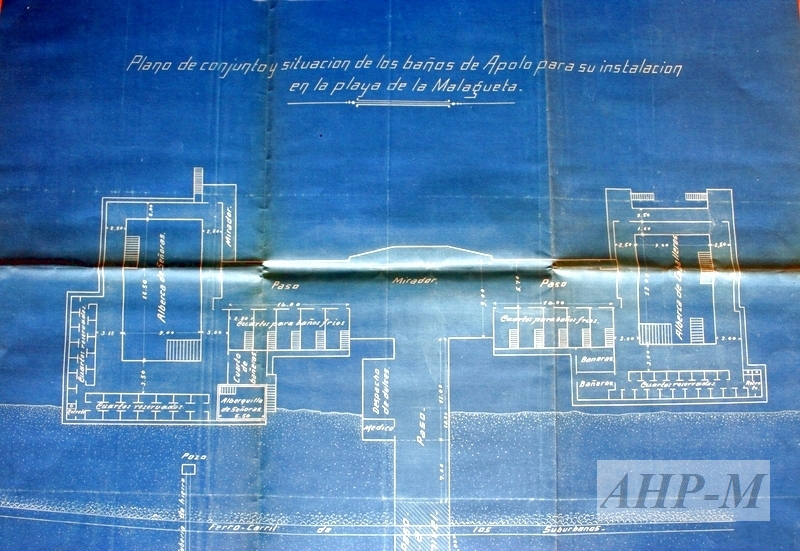 1917, enero, 7. Málaga. Archivo Histórico Provincial de Málaga. Demarcación de Costas. Sig. MPD 15995. Plano de conjunto y situación de los baños de Apolo para su instalación en la playa de la Malagueta.Plano (detalle); copia azográfica; escala 1:200; 48'5 x 63 cm; autores: Fernando Herrera Stracham y Juan Álvarez Gordillo. Observ.: cada año se presentaba la solicitud para las construcciones efímeras de los balnearios en las playas de Málaga. MFE.