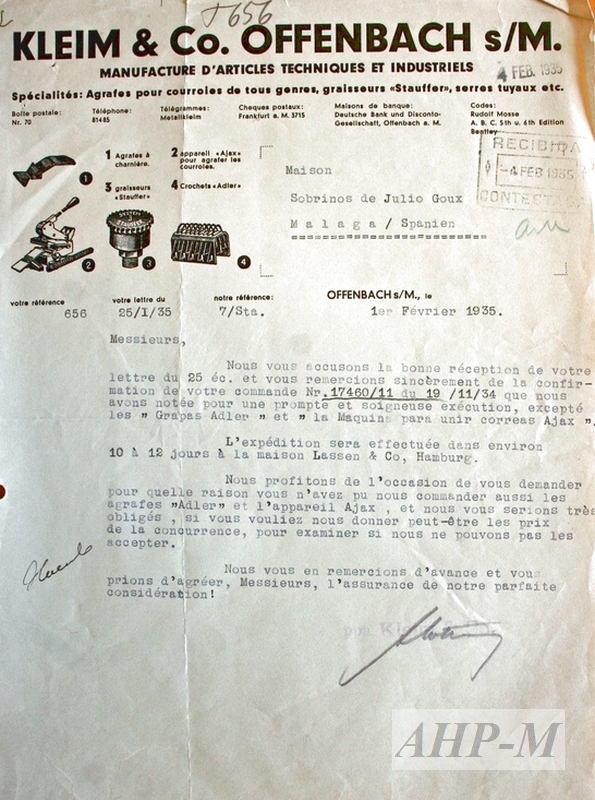 1935, febrero, 1. Frankfurt. Archivo Histórico Provincial de Málaga. Archivo de La Metalúrgica. Sig. 75276/8. Acuse de recibo de un pedido realizado por la empresa Sobrinos de Julio Goux a la compañía Kleim & Co. Offenbach s/M. Carta. Observ.: en los fondos de La Metalúrgica se conserva numerosa correspondencia comercial con empresas europeas. ADS.