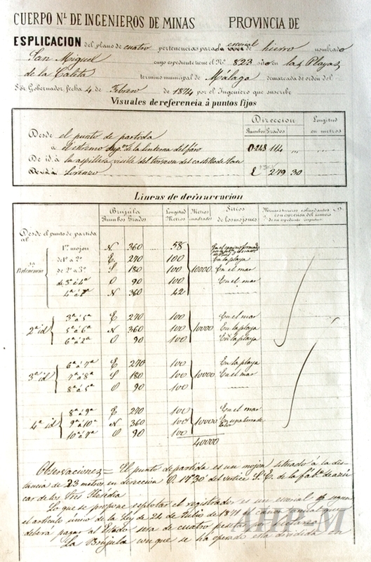 1874, abril, 11. Málaga. Archivo Histórico Provincial de Málaga. Jefatura de Minas. Sig. 8923. Demarcación del escorial de hierro titulado San Miguel, nº 823 en las Playas de la Caleta de Málaga. Expediente; plano de demarcación y cuaderno de brújula. Plano; manuscrito; color; escala 1:5000; autores: Francisco de la Dávila, Ingeniero Jefe, y Enrique Pérez Ortega, auxiliar facultativo. MFE.