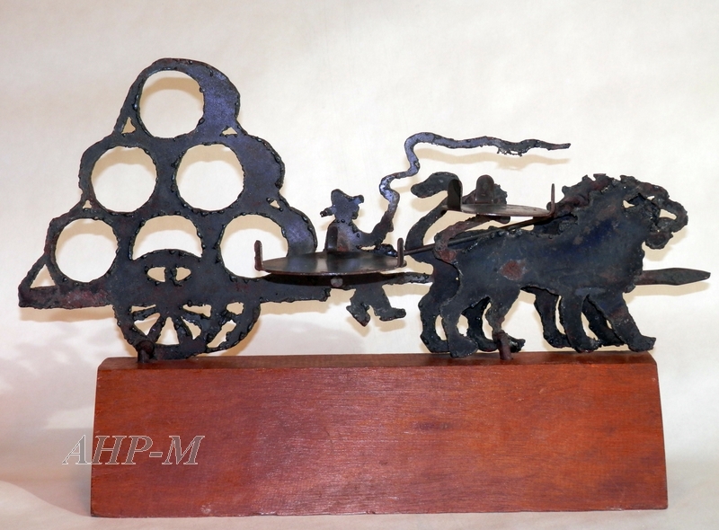 [1940-1960]. Málaga. Archivo Histórico Provincial de Málaga. Archivo Rafael Soto. Sig. OBJ 024. Dos leones transportando unos toneles, representación de la casa bodeguera de López Hermanos, S.A. Portacopas; forja con soporte de madera. MFE.