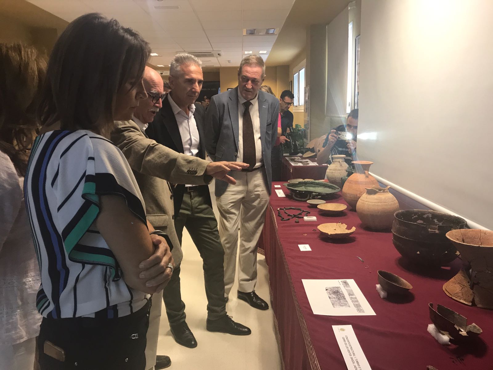 Los responsables del Instituto Universitario de Investigación en Arqueología Ibérica de Jaén muestran las piezas de la muestra a Miguel Ángel Vázquez.