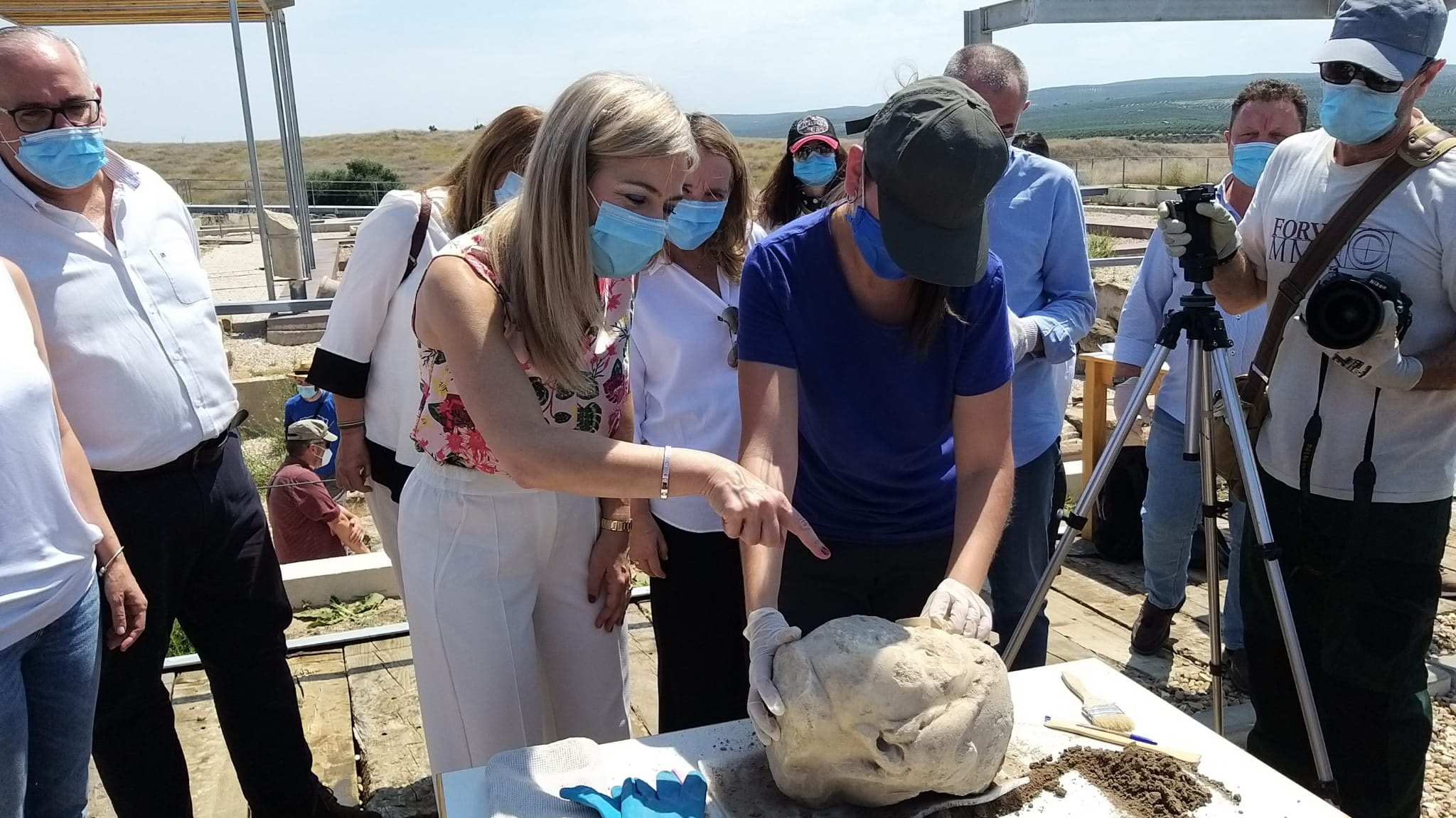 La consejera de Cultura y Patrimonio Histórico, Patricia del Pozo, ha asistido este lunes en el Conjunto Arqueológico de Cástulo, en Linares (Jaén), al desenterramiento de una cabeza de mármol localizada en el yacimiento, que podría datar del siglo IV d.C., y que podría corresponder, según los primeros estudios, a una figura masculina del dios Marte o a la femenina de la diosa Minerva, documentada reiteradas veces en la ciudad romana de Cástulo.