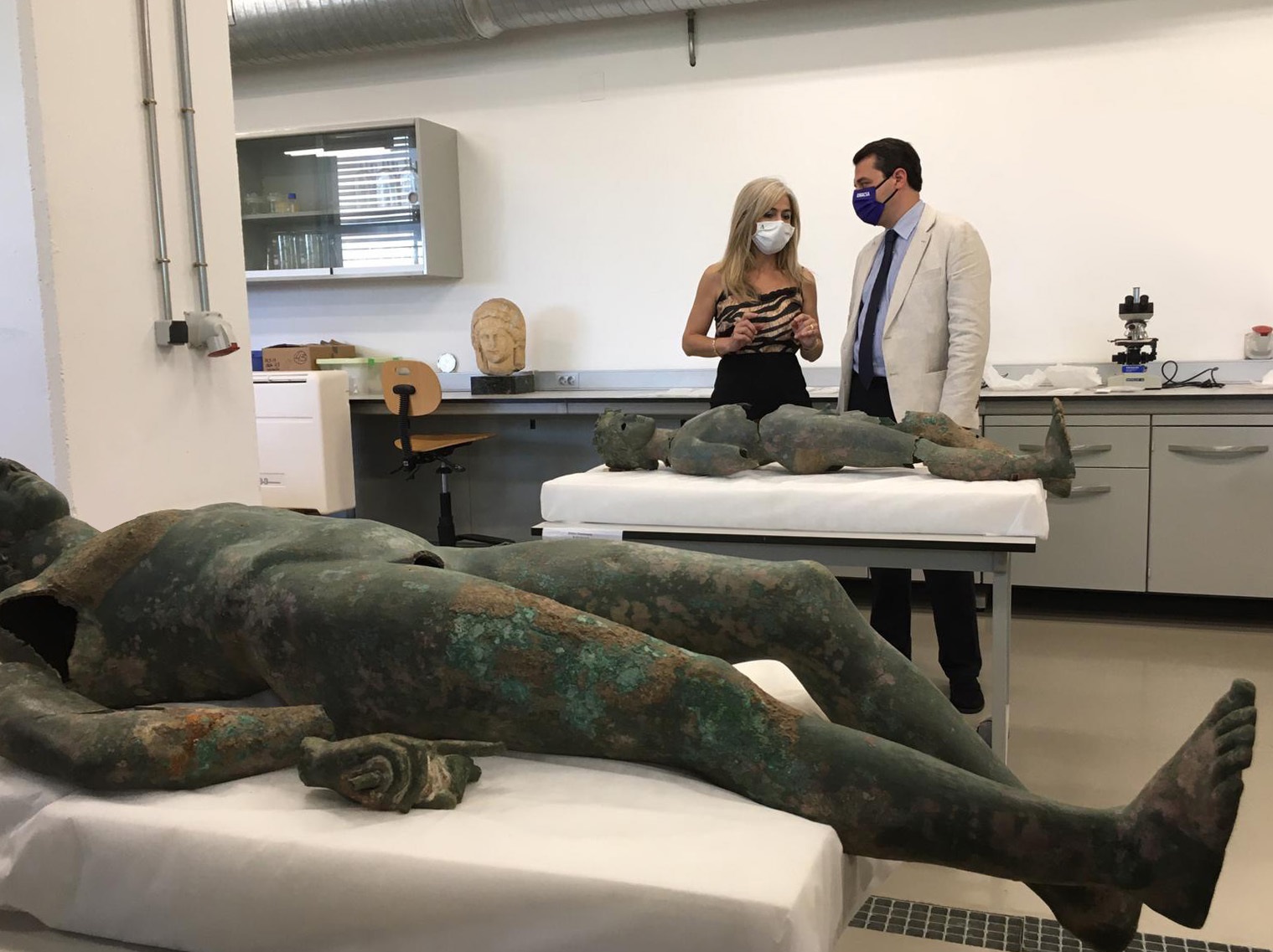 La consejera de Cultura y Patrimonio Histórico, Patricia del Pozo, ha visitado en el taller del Museo Arqueológico de Córdoba el estado de conservación de los efebos Apolíneo y Dionisíaco, las dos esculturas de bronce romanas incautadas en una operación policial en la localidad de Pedro Abad (Córdoba), antes de su traslado al Instituto Andaluz de Patrimonio Histórico (IAPH), donde se procederá a una minuciosa investigación y su posterior restauración.