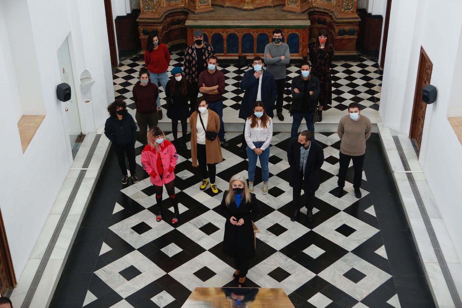 La consejera de Cultura y Patrimonio Histórico, Patricia del Pozo, junto a los doce jóvenes creadores cuyas obras componen la exposición del CAAC