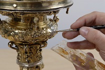 Detalle de la restauración de una pieza de orfebrería, en concreto una cruz parroquial