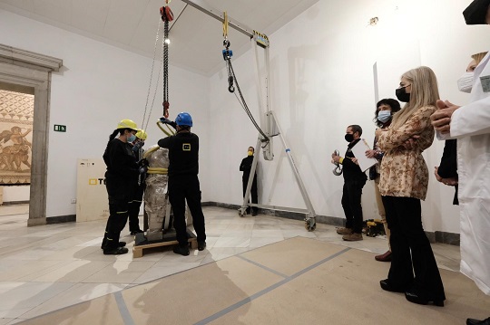 A escasos días de cumplirse los dos años del inicio de la operación de embalaje y transporte –el Museo cerró sus puertas el 12 de enero de 2020–, la consejera de Cultura y Patrimonio Histórico ha supervisado esta mañana el final de los trabajos de embalajes especiales que abarca a un total de 645 piezas que, por sus especiales condiciones de peso o conservación, necesitan contenedores específicamente diseñados para cada una de ellas. Gracias a esta operación se han almacenado y preparado para el transporte piezas tan emblemáticas como la gran mayoría de los emperadores del óvalo, el Matrimonio de Orippo, el Apolo Citaredo y el torso de Diana.