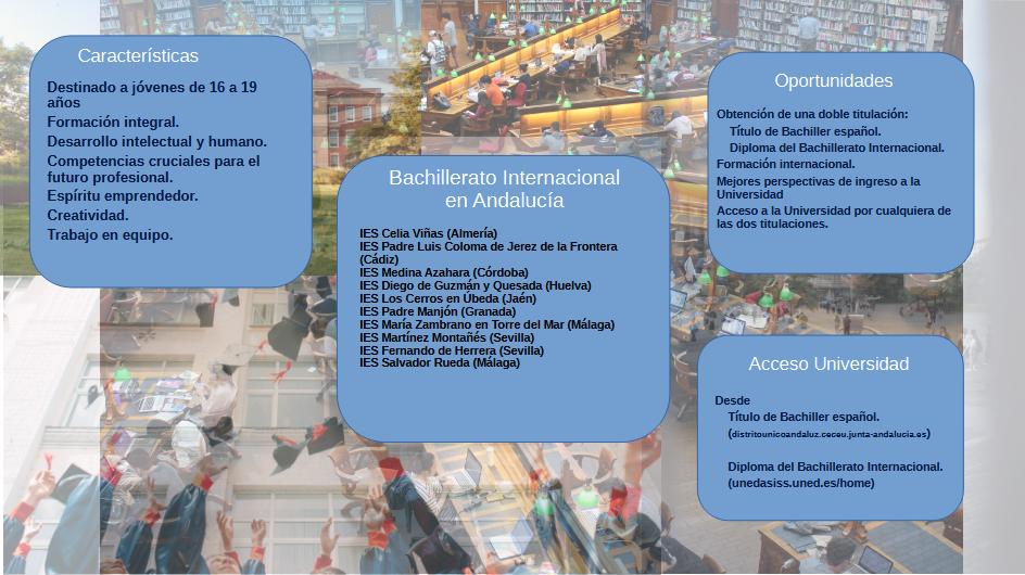 Los alumnos o alumnas que haya superado el Diploma del Bachillerato Internacional podrán acceder a la Universidad presentándose a la prueba de acceso general del Distrito Único Andaluz o bien utilizando el acceso desde el IB.