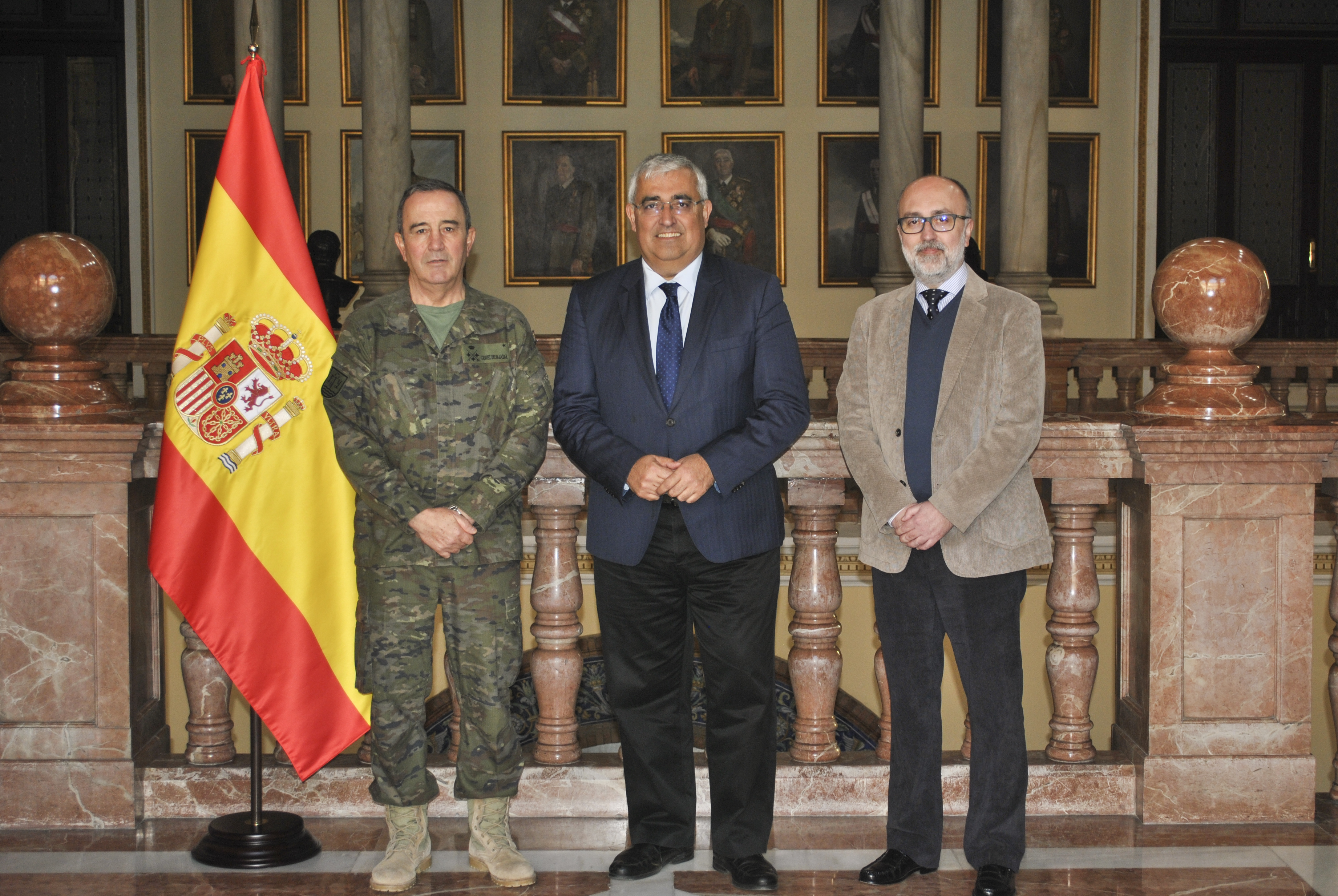 En la imagen, de izquierda a derecha, el Jefe de la Fuerza Terrestre Teniente General Juan Gómez de Salazar Mínguez, el Consejero de Economía y Conocimiento de la Junta de Andalucía, Antonio Ramírez de Arellano y el viceconsejero de Economía y Conocimiento, Antonio Valverde.