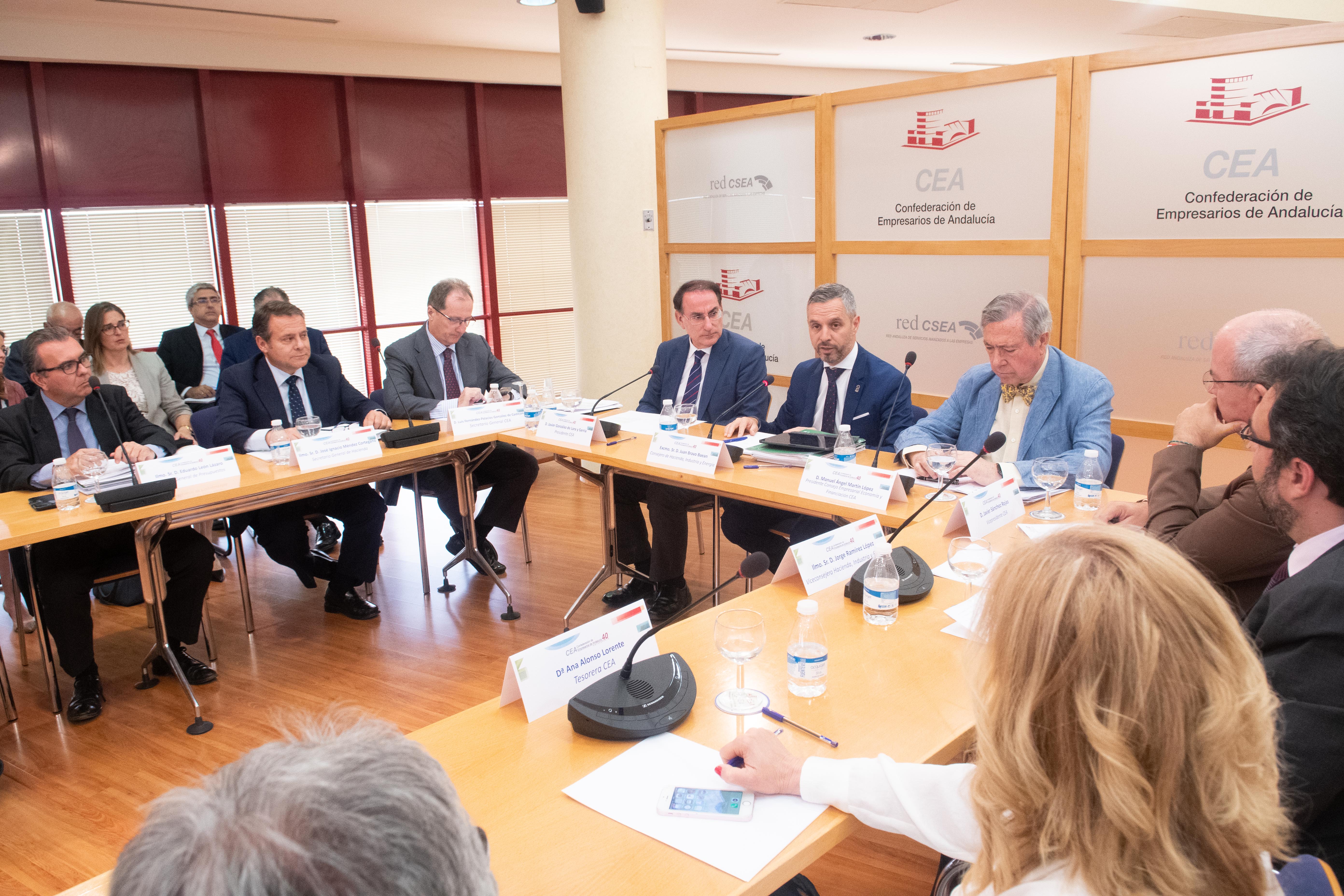 El equipo de la Consejería de Hacienda, Industria y Energía liderado por el consejero, Juan Bravo; el viceconsejero, Jorge Ramírez; el secretario general de Hacienda, Ignacio Méndez, y el director general de Presupuestos, Eduardo León, ha expuesto ante una nutrida representación de empresarios y dirigentes de organizaciones empresariales miembros de la Confederación de Empresarios de Andalucía (CEA) las grandes líneas del proyecto de Ley de Presupuesto de 2019, unas cuentas que se caracterizan por la “credibilidad”, ya que se basan en un mayor control del gasto, una búsqueda de la eficiencia en todas las partidas y el máximo aprovechamiento tanto de los fondos europeos como de los fondos finalistas procedentes del Estado.