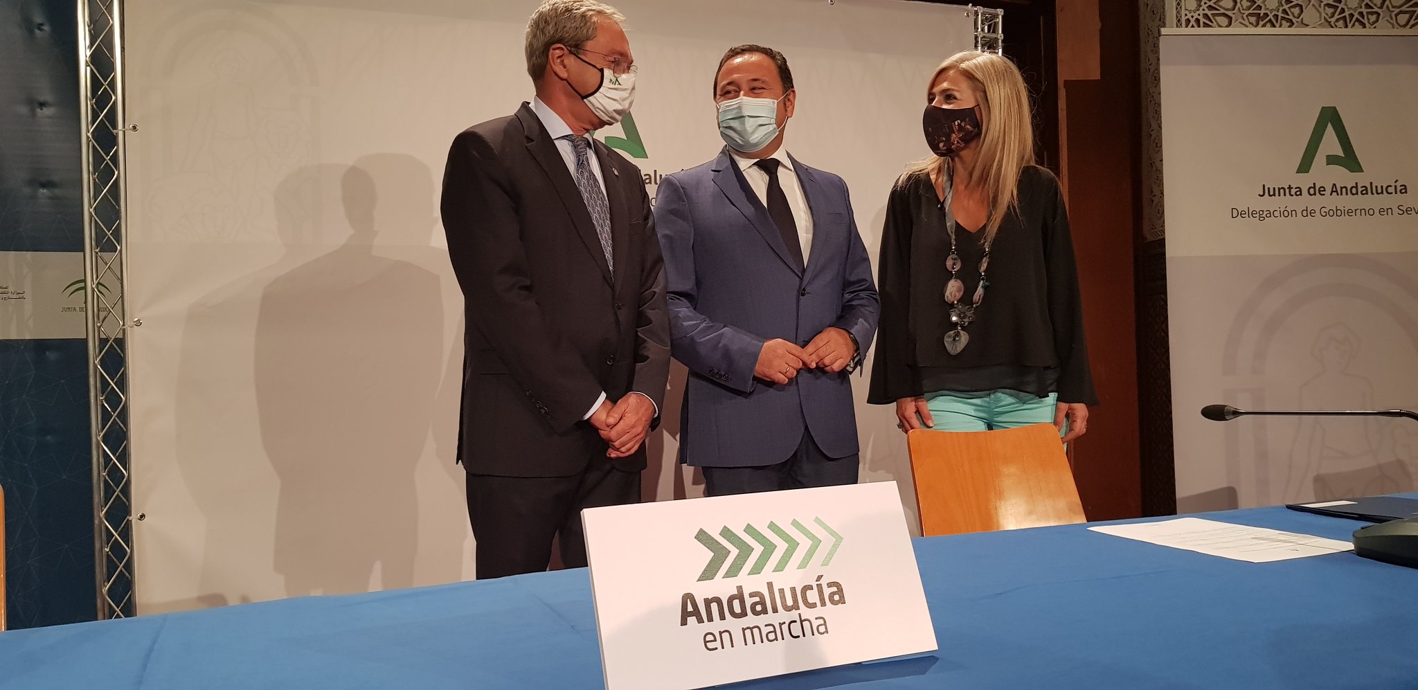 El consejero de Transformación Económica, Industria, Conocimiento y Universidades, Rogelio Velasco, la consejera de Cultura y Patrimonio Histórico, Patricia del Pozo, y el delegado de la Junta de Andalucía en Sevilla, Ricardo Sánchez, han presentado en la Fundación Tres Culturas, las actuaciones contempladas en la provincia de Sevilla dentro del plan "Andalucía en Marcha" y que tiene como objetivo reactivar la economía, generar empleo y modernizar infraestructuras y servicios en todas las provincias andaluzas. En Sevilla, el plan “Andalucía en Marcha” movilizará en torno a 600 millones de euros en actuaciones en Fomento, Salud, Educación, Justicia y Medio Ambiente.