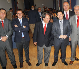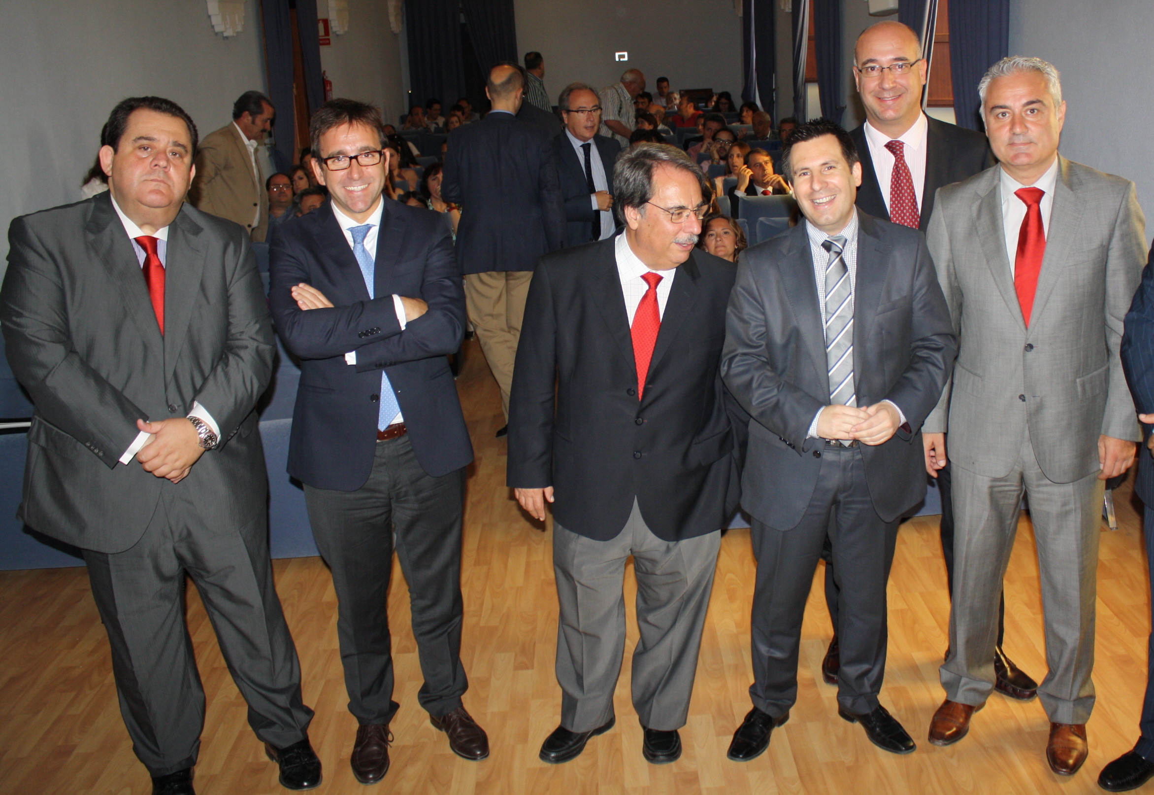 De izquierda a derecha (delante): Director Empresas Territorial Andalucía del Santander, José Pérez, Director General de Políticas Activas de Empleo del SAE, José Antonio Amate; Rector UNÍA, Eugenio Domínguez ; Delegado de Economía, Innovación, Ciencia y Empleo, José Ignacio Expósito ; Director Zona de Córdoba Santander, José Manuel Tercero.