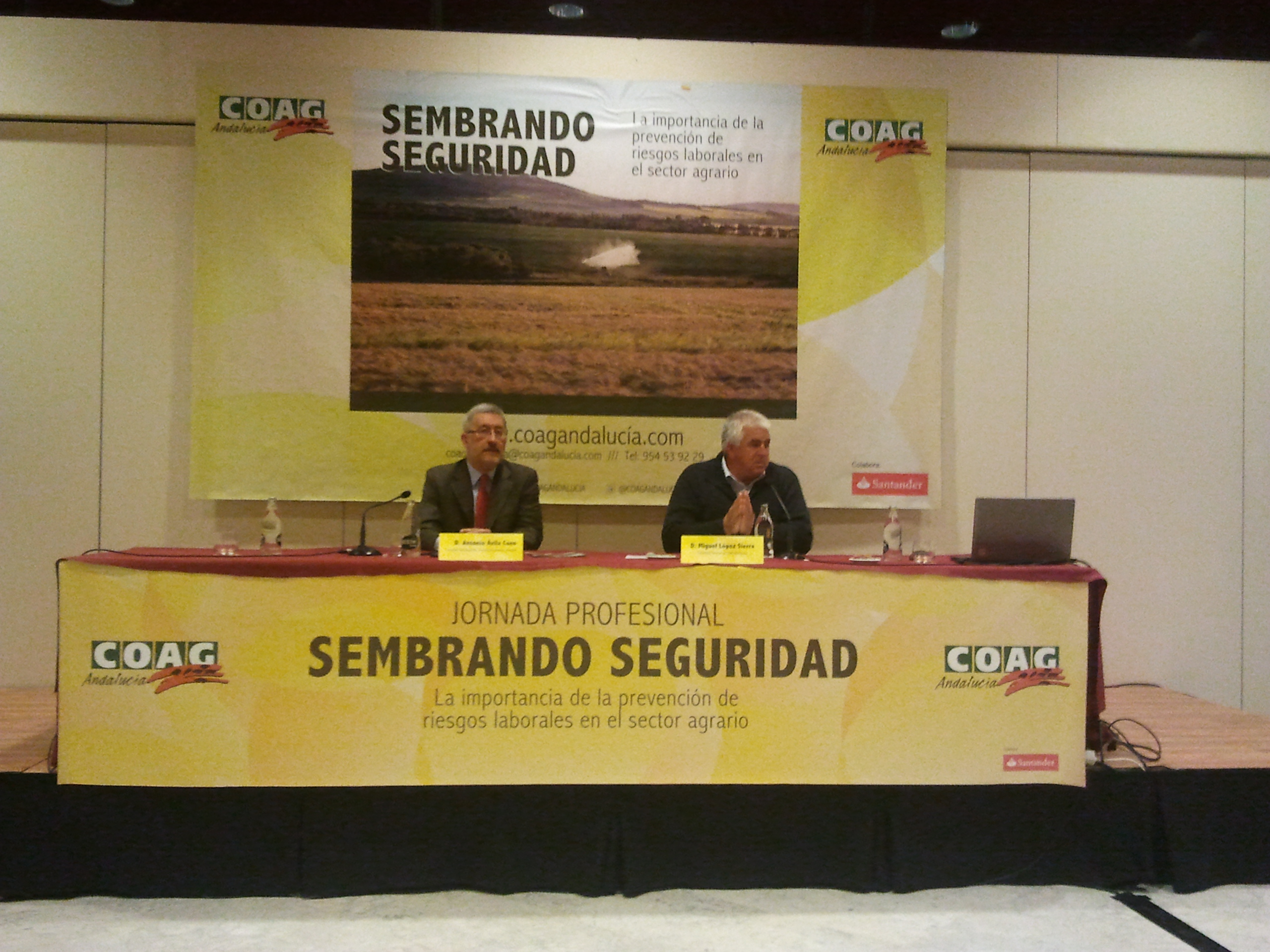 El consejero de Economía, Antonio Ávila, y el secretario general de COAG Andalucía, Miguel López, en las jornadas sobre prevención en el sector primario.