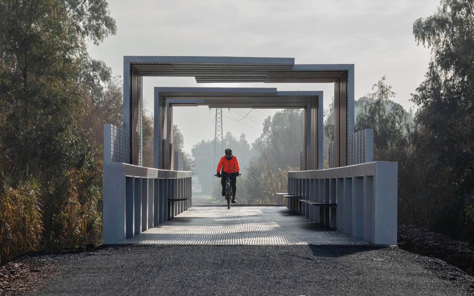 A lo largo del recorrido hay previstas nueve áreas de descanso. A esta altura del recorrido destaca una de las actuaciones singulares: la construcción de un puente parcialmente cubierto de 30 metros que salvará el arroyo del Prado y cuyo diseño reinterpretará el antiguo puente del ferrocarril de Tharsis. Una infraestructura que, además de servir de homenaje, también proporcionará zona de sombra al visitante.