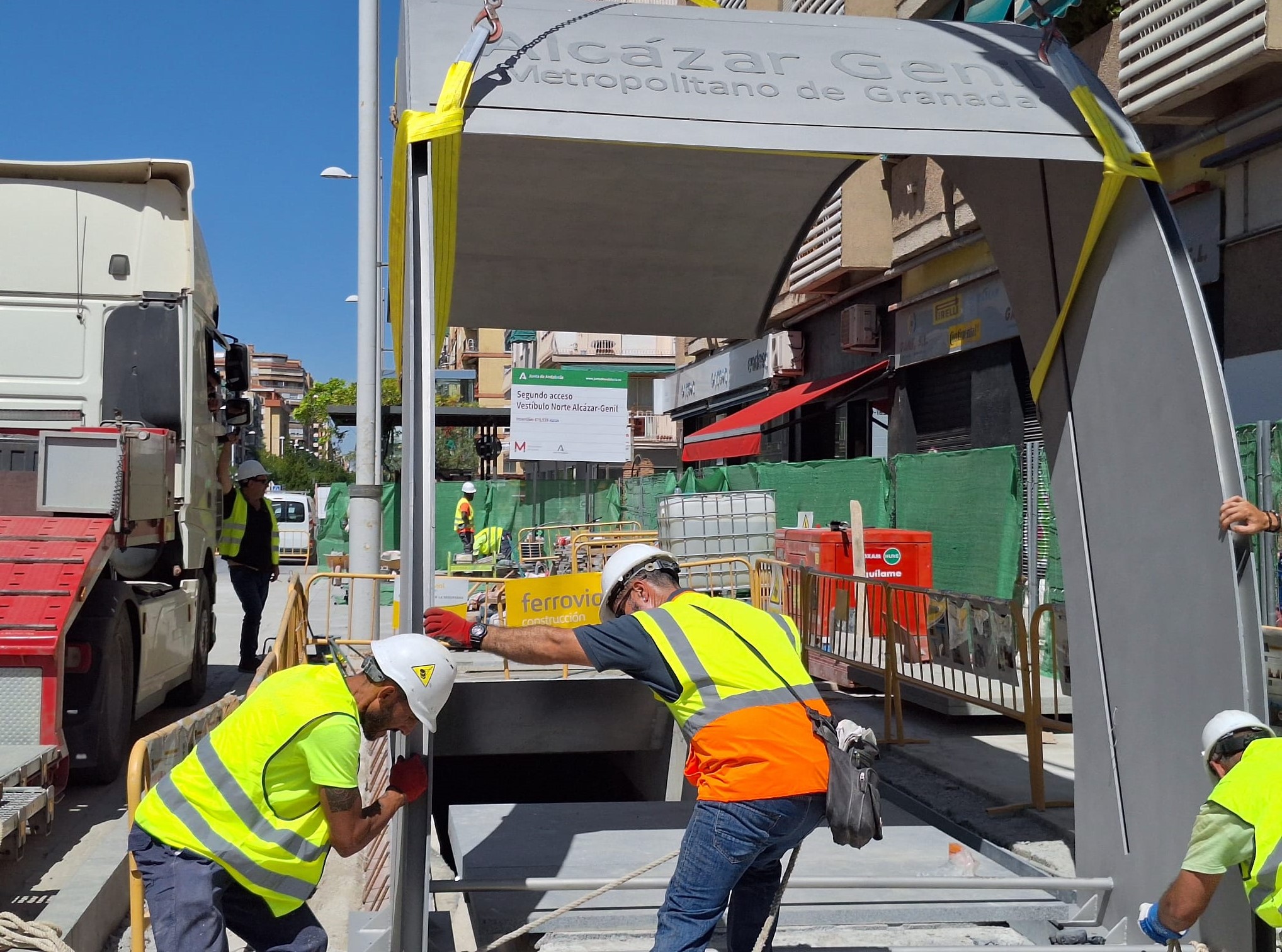 Las obras del segundo acceso a la sala Jiménez Torrecillas, ubicada en el vestíbulo norte de la Estación de Alcázar Genil del Metro de Granada, llegan a la recta final con la instalación del edículo o boca de metro. Se trata de una estructura singular, idéntica al resto de las bocas de metro de Camino de Ronda, que dará acceso directo a la sala multiusos y que permitirá también un nuevo acceso al andén desde el vestíbulo norte de la estación.