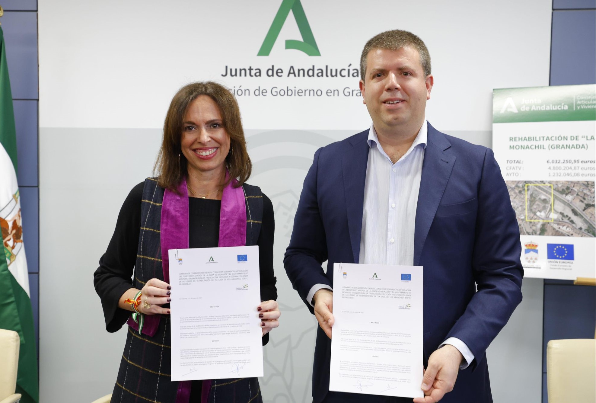 La consejera de Fomento, Rocío Díaz, y el alcalde de Monachil, José Morales, en la firma del convenio hace unos meses.