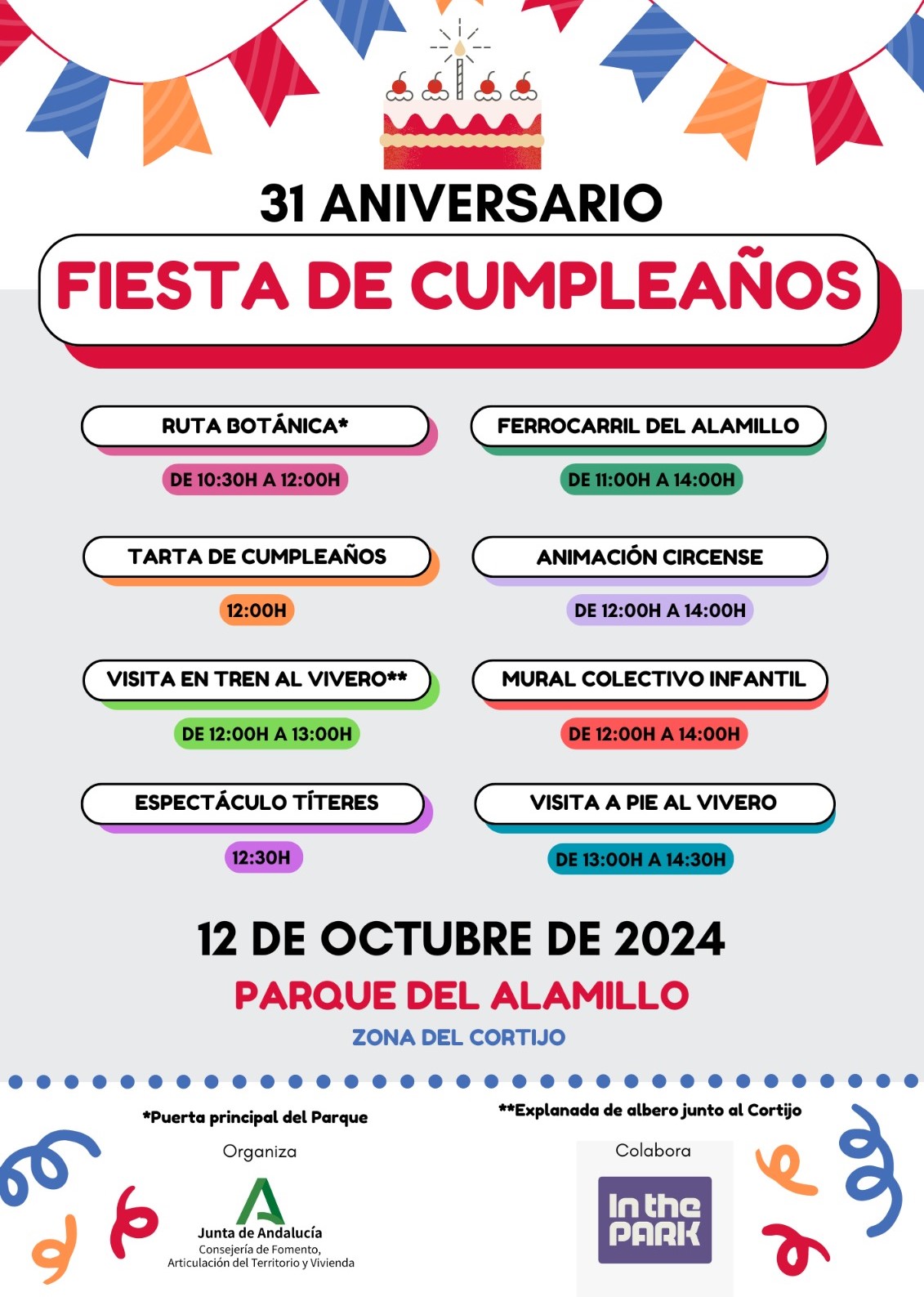 El parque del Alamillo celebrará el próximo sábado día 12 de octubre su 31 aniversario con un intenso programa de actividades lúdicas en la que podrán participar mayores y niños. Rutas botánicas, teatro de títeres, animación circense, actuación de gaiteros y la tradicional tarta de cumpleaños forman parte de la programación especial en el parque gestionado por la Consejería de Fomento, Articulación del Territorio y Vivienda, que además coincidirá con la celebración de la 14 edición del evento cultural In The Park.