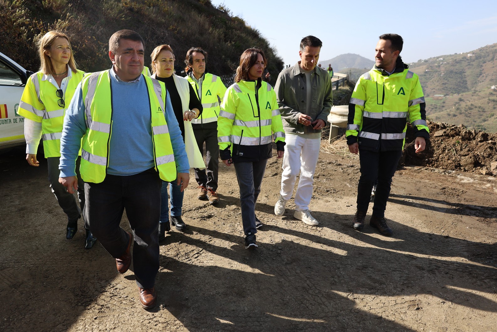 Rocío Díaz y los alcaldes han visitado las carreteras dañadas por la DANA en Málaga junto al viceconsejero de Fomento, Articulación del Territorio y Vivienda, Mario Muñoz-Atanet; el director general de Infraestructuras Viarias, Alfonso Lujano; la delegada Territorial de Fomento en Málaga, María Rosa Morales, y el parlamentario andaluz José Ramón Carmona.