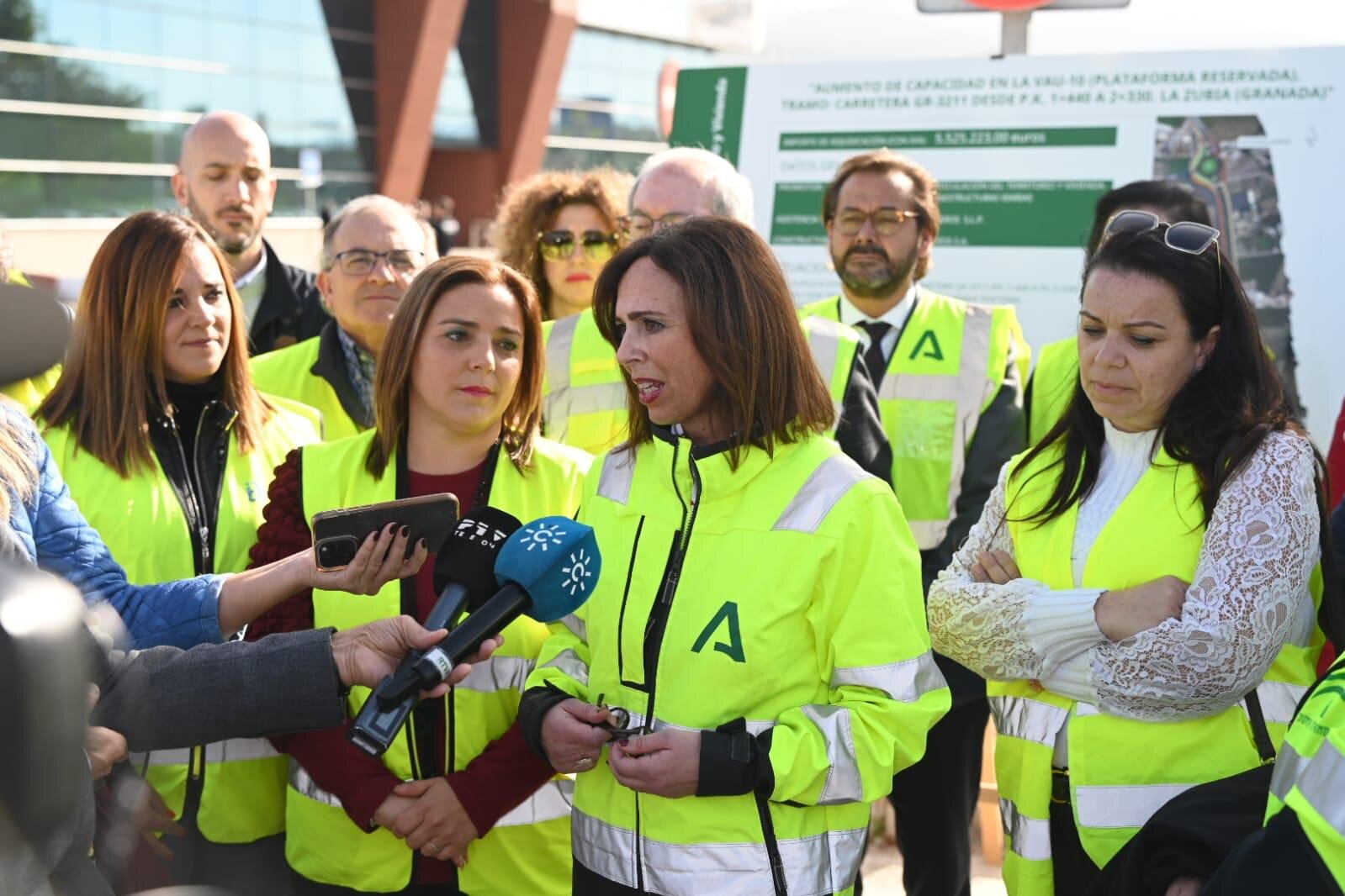 La consejera de Fomento, Rocío Díaz, en el inicio de las obras de la plataforma reservada en la carretera entre La Zubia y Granada.