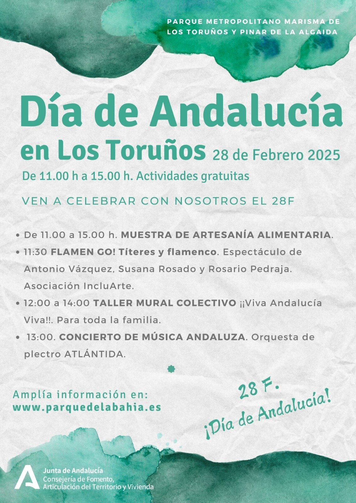 El Parque Metropolitano Marísma de Los Toruños y Pinar de la Algaida celebrará el Día de Andalucía con un intenso programa de actividades gratuitas para que participen todos los usuarios que lo deseen. El evento se desarrollará el viernes 28 de febrero en la Casa de Los Toruños y está organizado por la Consejería de Fomento, Articulación del Territorio y Vivienda, que gestiona este espacio natural de uso público y que pretende hacer de esta festividad un día de diversión y disfrute en familia.