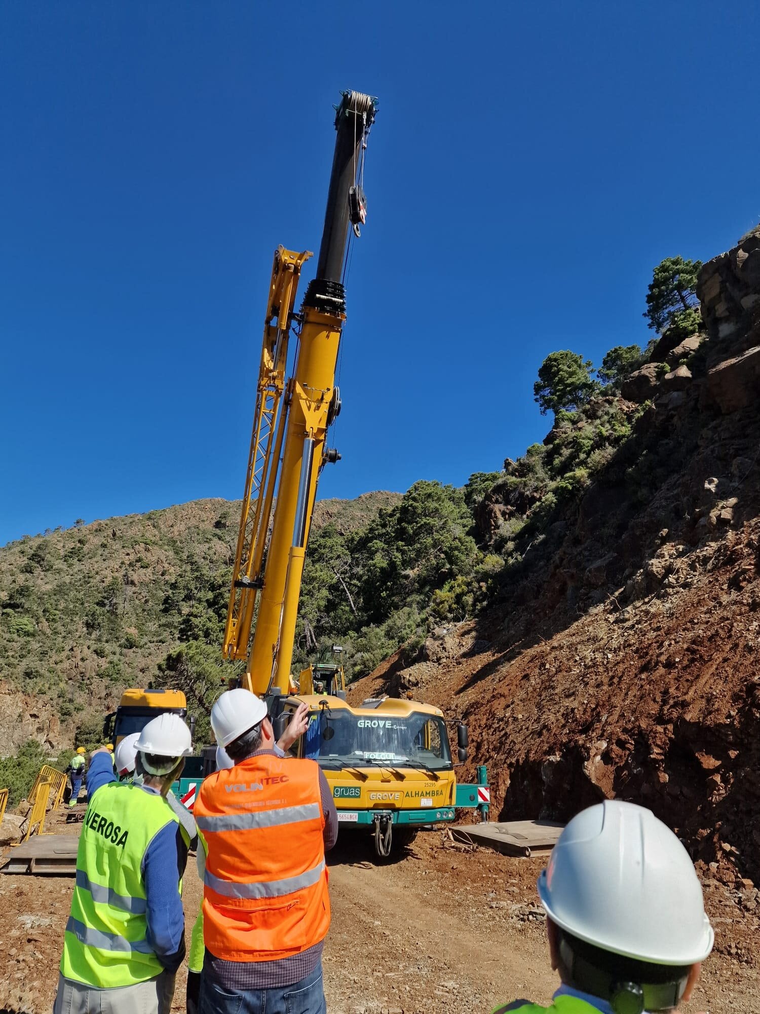 Los trabajos desarrollados hasta ahora se han centrado en la limpieza y retiradas de roca de la zona de cabecera e intermedia del deslizamiento para estabilizar la ladera. De hecho, se ha instalado una barrera semidinámica y una membrana de contención del talud en la parte más elevada. En la actualidad, un equipo formado por una veintena de personas sigue retirando rocas e instalando una membrana de contención en la zona intermedia, donde se dispone de una grúa de gran alcance para subir materiales.