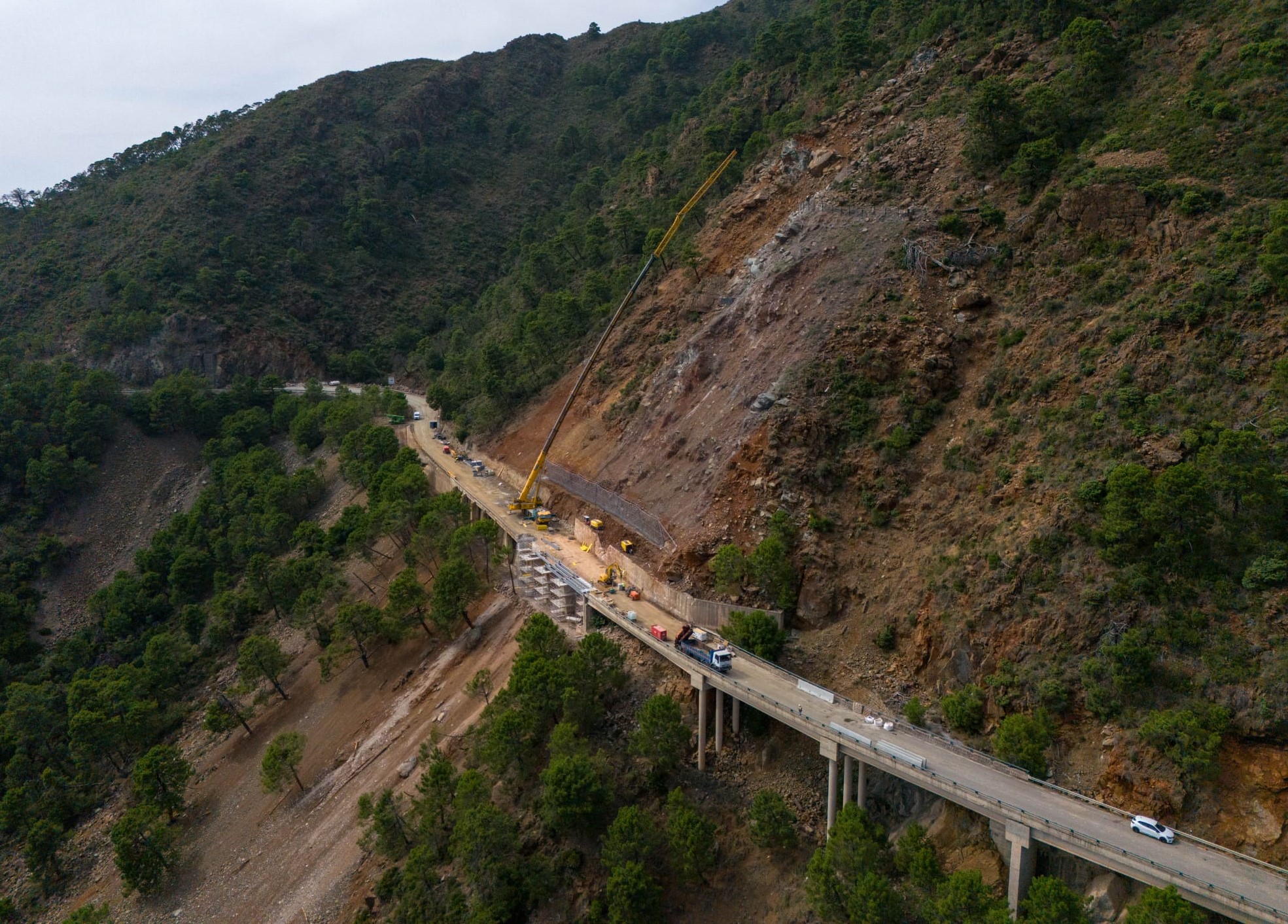 Las obras de la carretera que conecta Ronda con San Pedro Alcántara (A-397), en la provincia de Málaga, ya superan su ecuador. Esta semana han quedado instaladas las vigas de los cuatro vanos del viaducto que quedaron destrozados a consecuencia de los desprendimientos de la ladera por las lluvias torrenciales.