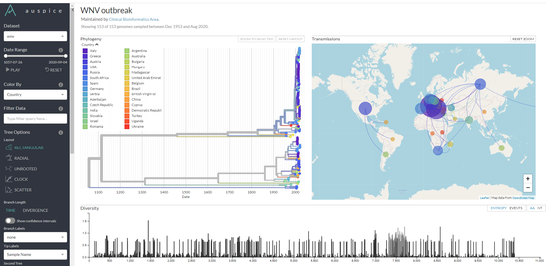 Los resultados de este estudio se encuentran disponibles en una plataforma vinculada al SIEGA donde se ofrece una vista interactiva de la filogenia completa del virus del Nilo Occidental con las cuatro secuencias completas pertenecientes al brote español de 2020 en el contexto del resto de secuencias virales disponibles pertenecientes a brotes mundiales que han sido secuenciadas en anteriores años (ver Tabla S1). Esta plataforma, desarrollada por los científicos del Área de Bioinformática, es una herramienta clave del sistema de vigilancia epidemiológica andaluza.