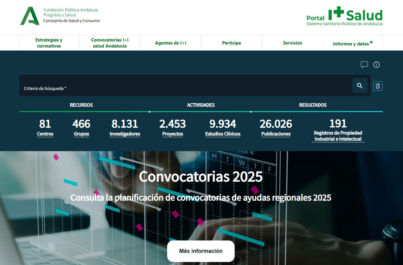De igual modo, el portal aumenta la visibilidad de la I+i generada en el sistema sanitario público andaluz y el reconocimiento al trabajo de los profesionales; apoya la toma de decisiones por parte de la institución sanitaria, los centros de investigación y las entidades de gestión de la I+i a través de cuadros de mando e informes de seguimiento de actividades; y fomenta la colaboración y maximizar el aprovechamiento de los recursos de investigación, facilitando el contacto con investigadores o grupo próximos con capacidades de interés para sus propias actividades de investigación.