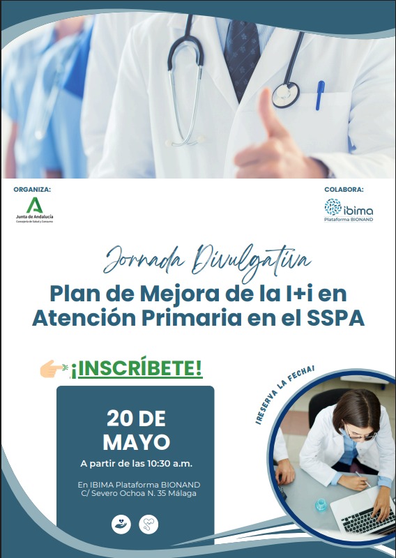 La Consejería de Salud y Consumo de la Junta de Andalucía, a través de la Secretaría General de Salud Pública e I+D+i en Salud, celebrará el próximo 20 de mayo en el salón de actos de IBIMA-Plataforma BIONAND (Málaga) una jornada científica de divulgación centrada en el Plan de Mejora de la Investigación en Atención Primaria en el Sistema Sanitario Público de Andalucía (2025-2027).