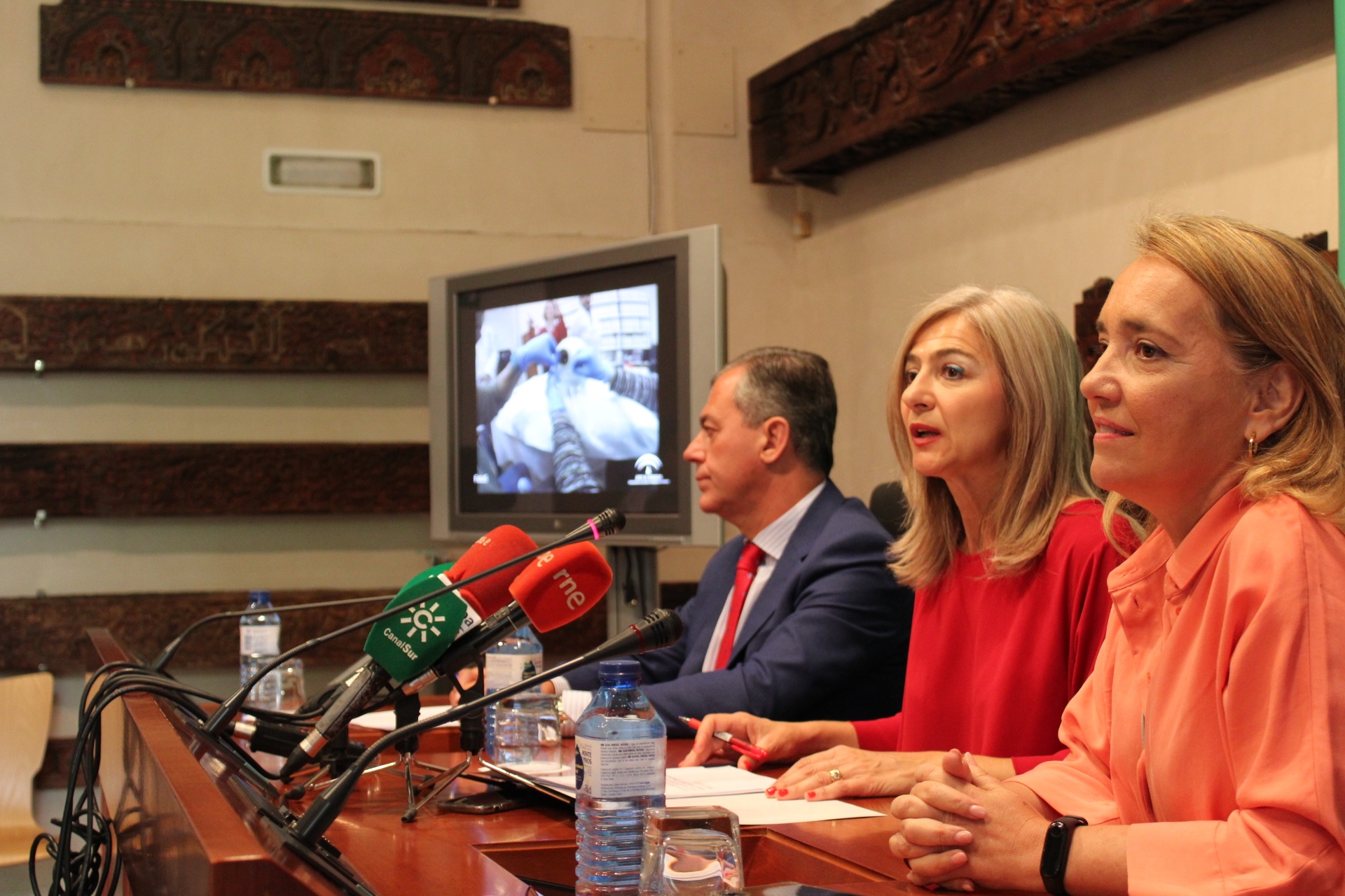 De izquierda a derecha, José Luis Sanz, alcalde de Tomares; Patricia del Pozo, consejera de Cultura; y Macarena O'Neill, secretaria general de Patrimonio, durante la rueda de prensa