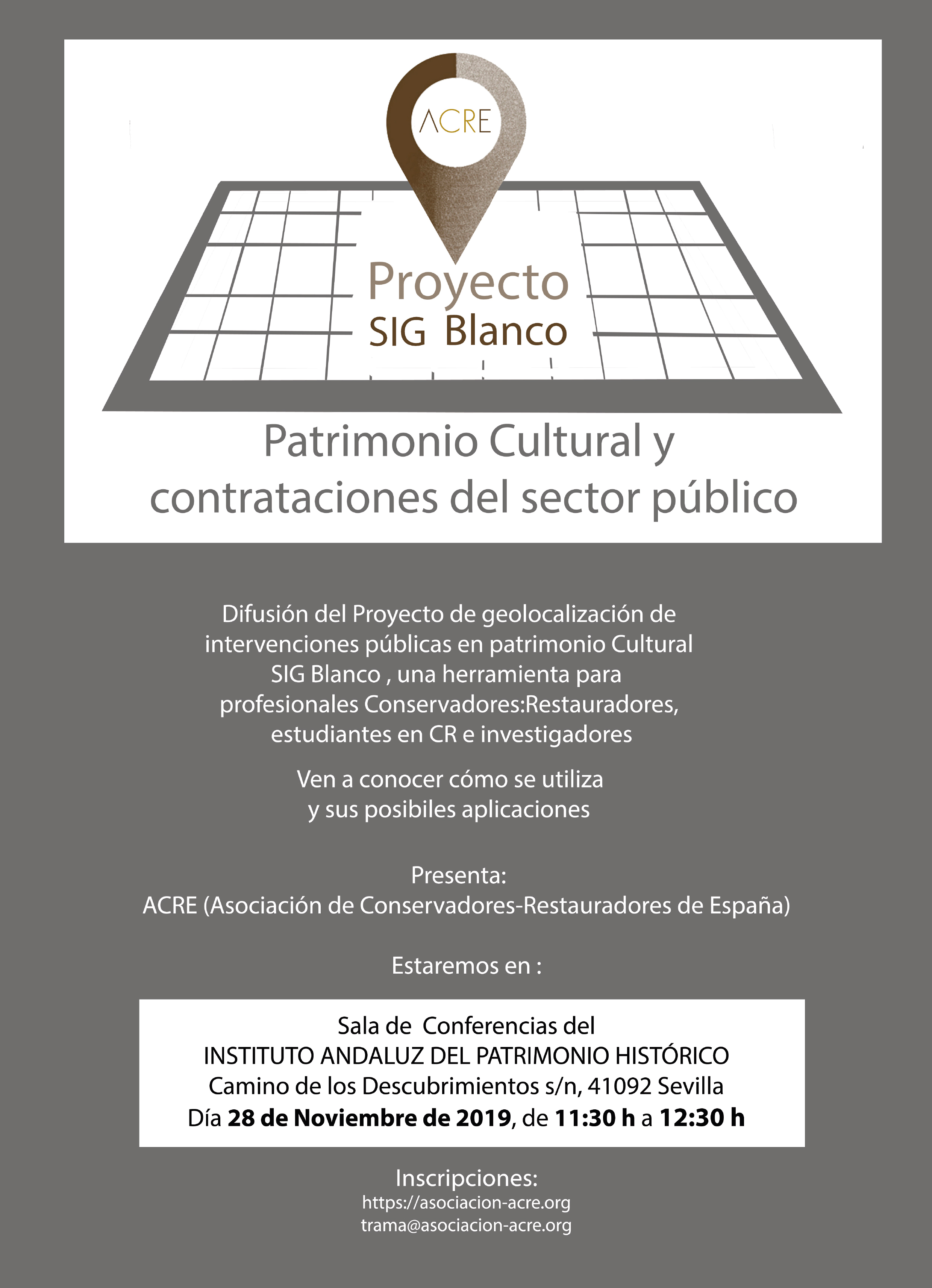 La Asociación Profesional de Conservadores Restauradores de España (ACRE) presentará en el Instituto Andaluz del Patrimonio Histórico el proyecto Lista Blanca-SIG Blanco. El objetivo de este proyecto es generar conocimiento basado en la recopilación y la difusión de intervenciones que se vienen desarrollando en España en materia de patrimonio cultural desde el Sector Público. Para ello, ordena las licitaciones anunciadas en la Plataforma de Contratación del Sector Público de forma que dicha información pueda ser utilizada con fines formativos y de investigación.