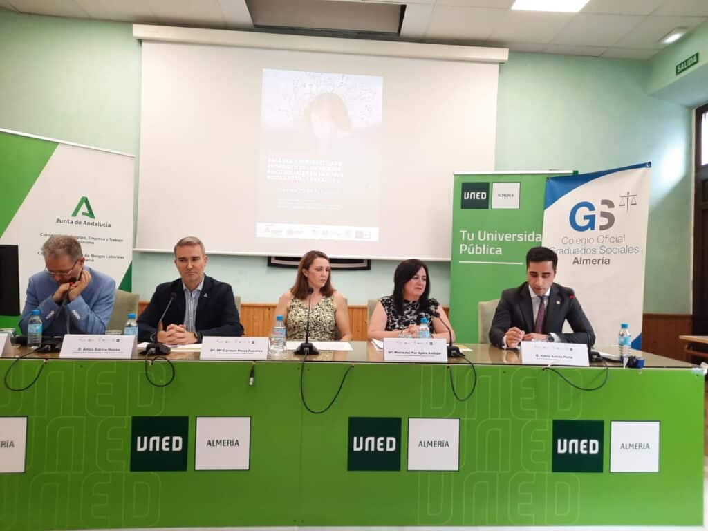 La inauguración institucional de la jornada correspondió D. Amós García Hueso, Delegado Territorial de Empleo, Empresa y Trabajo Autónomo en Almería, al que agradecemos que reservara un espacio de su ocupada agenda a este acto. En la Mesa estuvo acompañado por Dª María del Carmen Pérez Fuentes, nombrada recientemente directora de la UNED de Almería y anfitriona de la jornada (realizada en la sede de su bonito Centro Asociado), por Dª María del Mar Ayala Andújar, presidenta del Colegio Oficial de Graduados Sociales de Almería y D. Pablo Salido Mota, en representación del Colegio Oficial de Graduados Sociales de Jaén, en su condición de miembro de su Junta de Gobierno, así como por D. Cristóbal Molina Navarrete, el director del LARPSICO.
