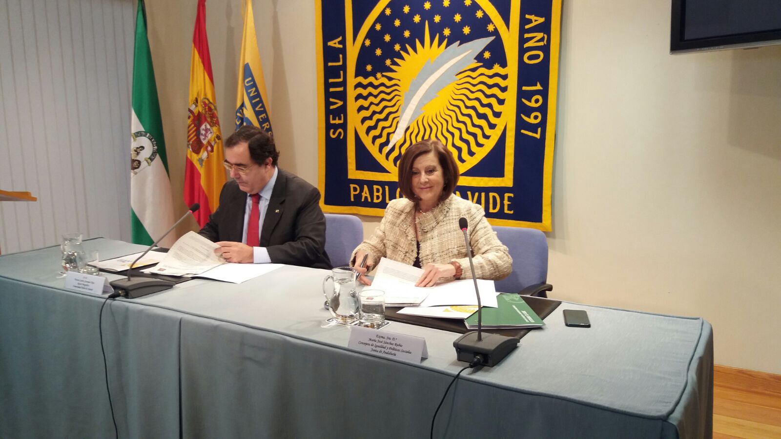 La Consejera de Igualdad y Políticas Sociales, María José Sánchez Rubio, y el rector de la Universidad Pablo de Olavide (UPO), Vicente Guzmán, han reforzado hoy la colaboración entre ambos organismos tras la firma de un Protocolo General de Colaboración para el desarrollo de actuaciones conjuntas en materia de servicios sociales, así como dos convenios específicos en relación a la Residencia Flora Tristán y el congreso de la Red Española de Políticas Sociales.