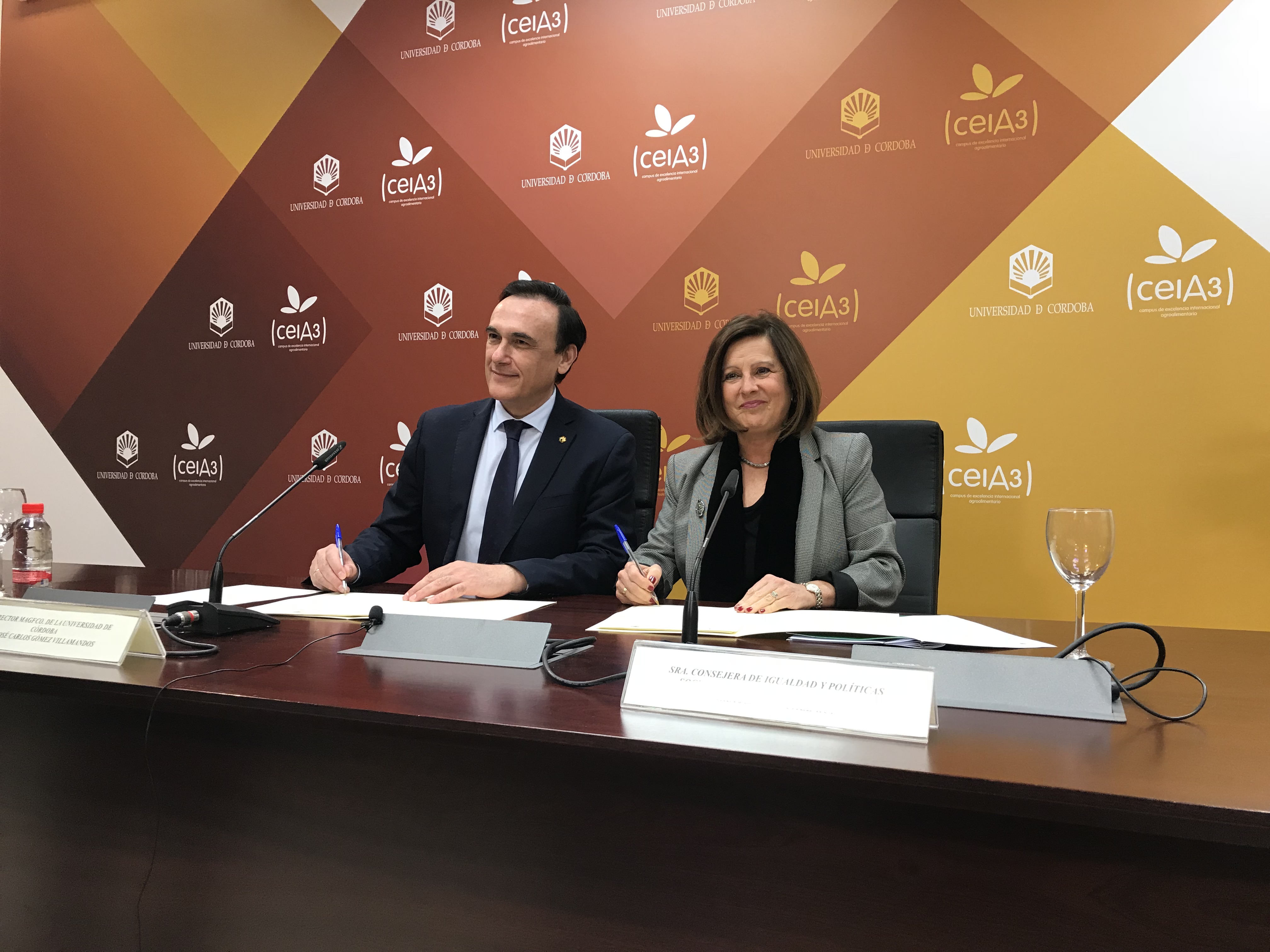 La consejera de Igualdad y Políticas Sociales, María José Sánchez Rubio, y el rector de la Universidad de Córdoba, José Carlos Gómez Villamandos, han renovado hoy la colaboración entre ambas instituciones con la firma de un Protocolo General de Colaboración en diversas áreas, con especial atención al ámbito relacionado con los servicios sociales.