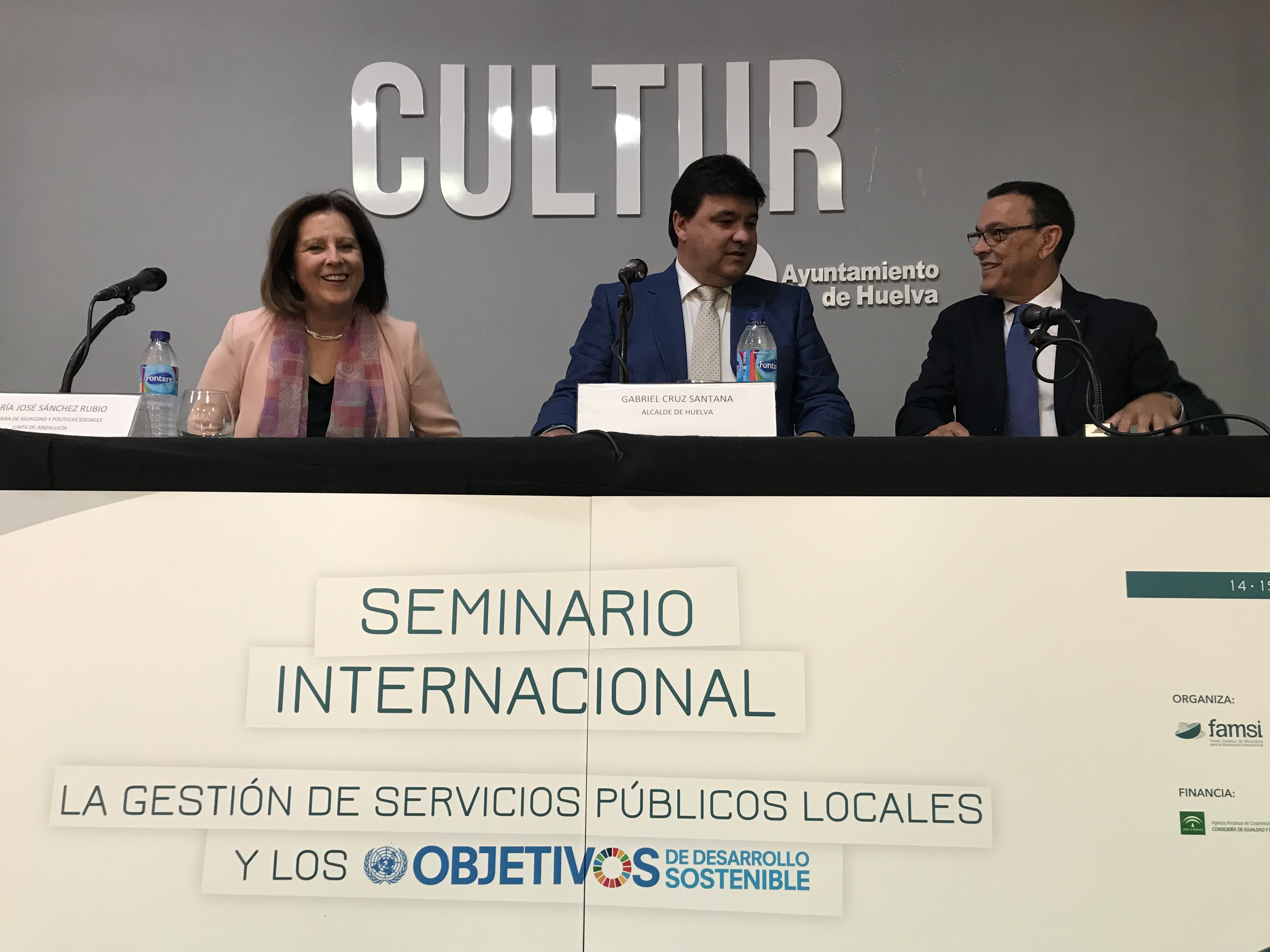 La consejera de Igualdad y Políticas Sociales, María José Sánchez Rubio, ha destacado la apuesta de Andalucía por el desarrollo sostenible de las ciudades para mejorar la calidad de vida de las personas. Así lo ha señalado durante la inauguración hoy en Huelva del Seminario Internacional “La Gestión de los Servicios Públicos Locales y los Objetivos de Desarrollo Sostenible”, organizado por FAMSI (Fondo Andaluz de Municipios para la Solidaridad Internacional).
