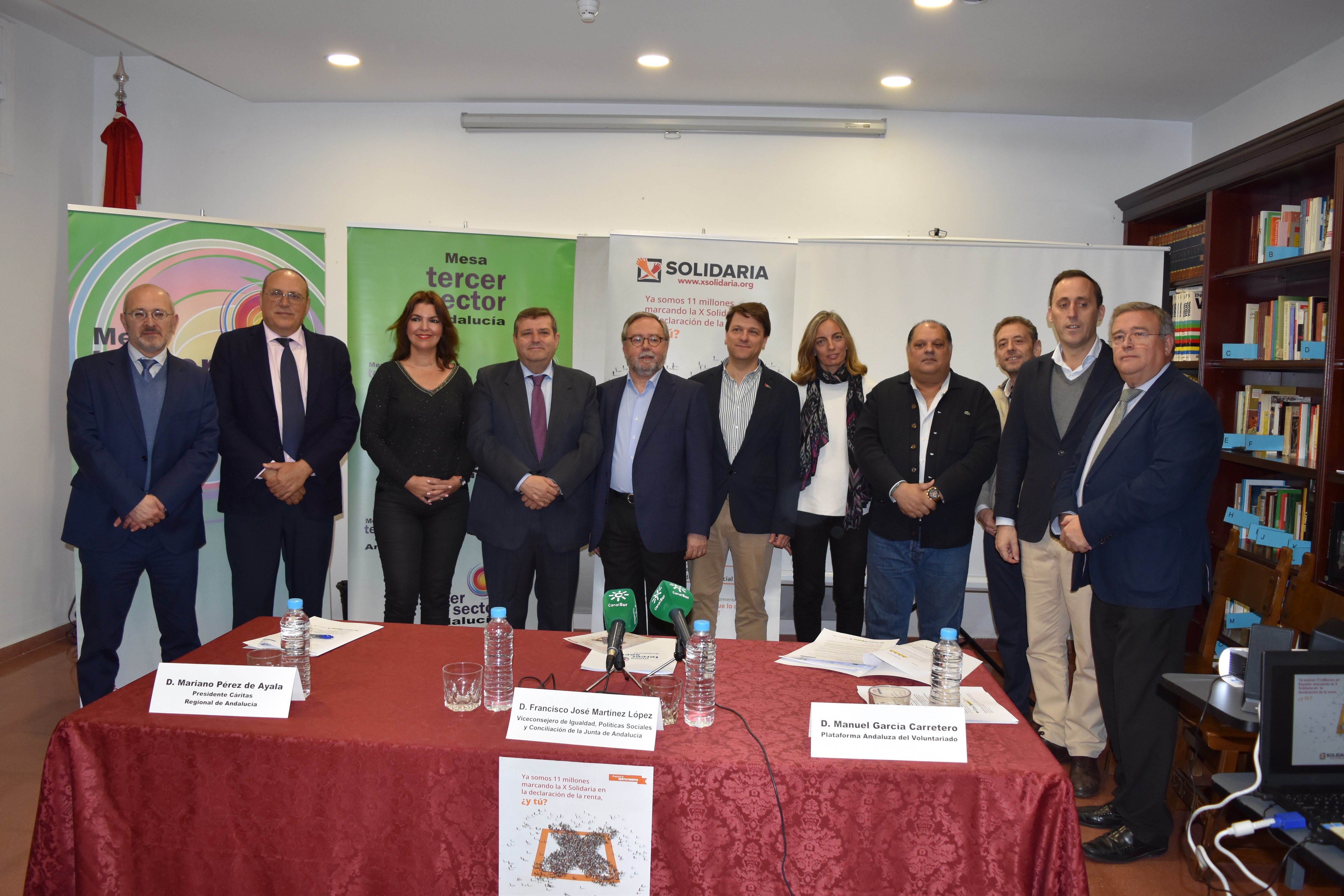 El viceconsejero de Igualdad, Políticas Sociales y Conciliación, Francisco José Martínez, ha cifrado en más de 891.000 las personas que son beneficiarias directas de los programas que se ejecutan en la Comunidad Andaluza con fondos provenientes de la ‘X solidaria’ de la Renta. Así lo ha manifestado en la presentación de la campaña que ha diseñado la Mesa del Tercer Sector con el objetivo de incrementar el número de contribuyentes que marquen las casillas 105 y 106 en su declaración de la Renta cada año.