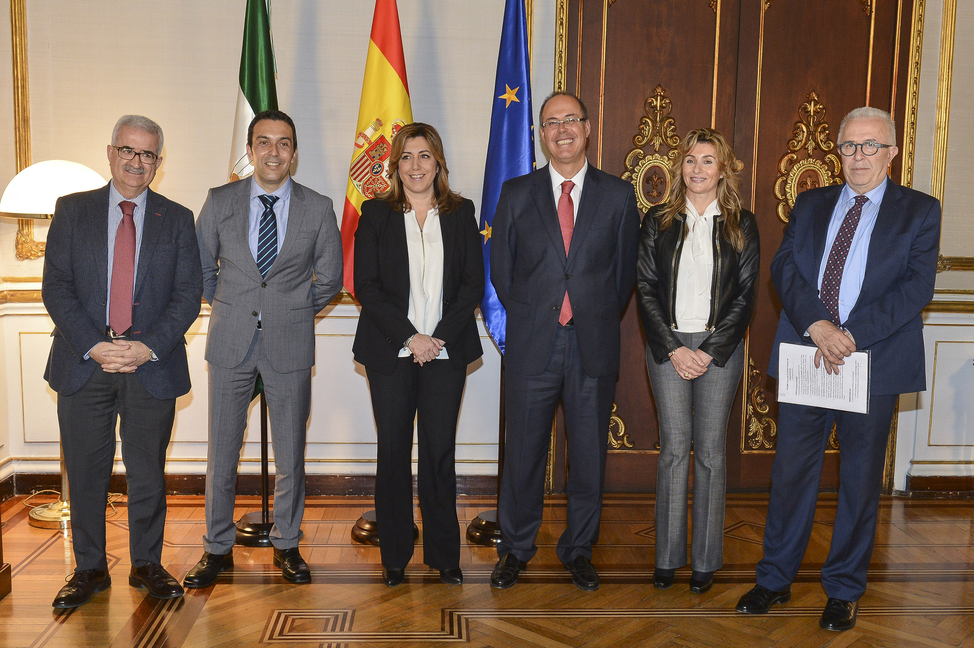 La presidenta de la Junta, Susana Díaz, y el consejero de Empleo, Empresa y Comercio, José Sánchez Maldonado, han recibido a la Asociación de Grandes Industrias del Campo de Gibraltar (AGI), encabezada por su presidente, Manuel Doblado. Además de informar sobre el programa previsto con motivo de la celebración de su 25º aniversario, los miembros de la AGI trasladaron a la presidenta temas de interés para seguir mejorando la competitividad en los mercados nacionales e internacionales.