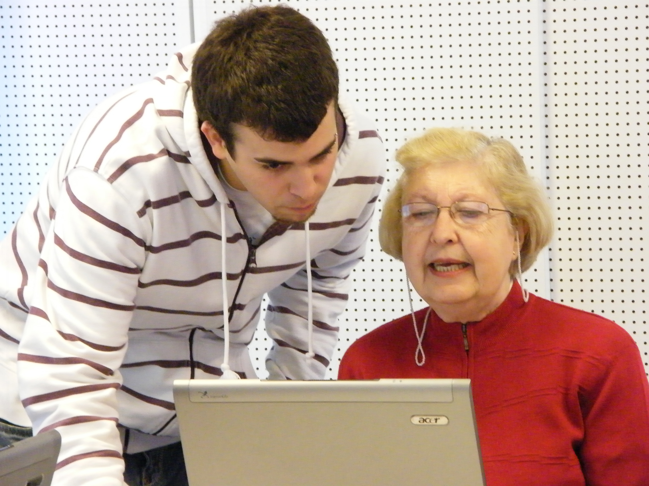 Un joven ayuda a una persona mayor en el manejo del ordenador