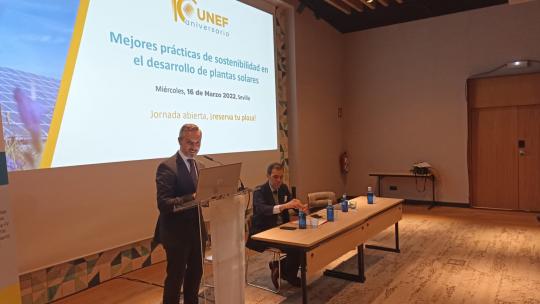 Estos datos los ha puesto de relieve el consejero de Hacienda y Financiación Europea, Juan Bravo, durante su intervención en la apertura de la Jornada Mejores prácticas de sostenibilidad en el desarrollo de plantas solares organizada por la asociación Unión Española Fotovoltaica (UNEF), donde ha estado acompañado por el presidente de UNEF, Rafael Benjumea.