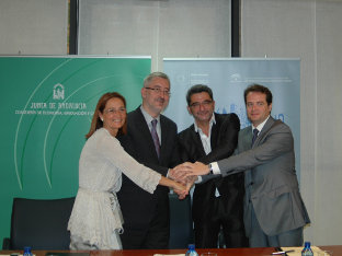 El consejero de Economía, Innovación y Ciencia, Antonio Ávila, y los alcaldes de los municipios de Mairena del Aljarafe, Antonio Conde; Lebrija, Mª José Fernández; y Alcalá de Guadaira, Antonio Gutiérrez Limones, han formalizado hoy los convenios por los que se pone a disposición de los empresarios locales un total de 79 naves con una superficie conjunta de más de 23.500 metros cuadrados en el marco del Programa de Actuaciones Conjuntas de Naves Industriales en Espacios Productivos.