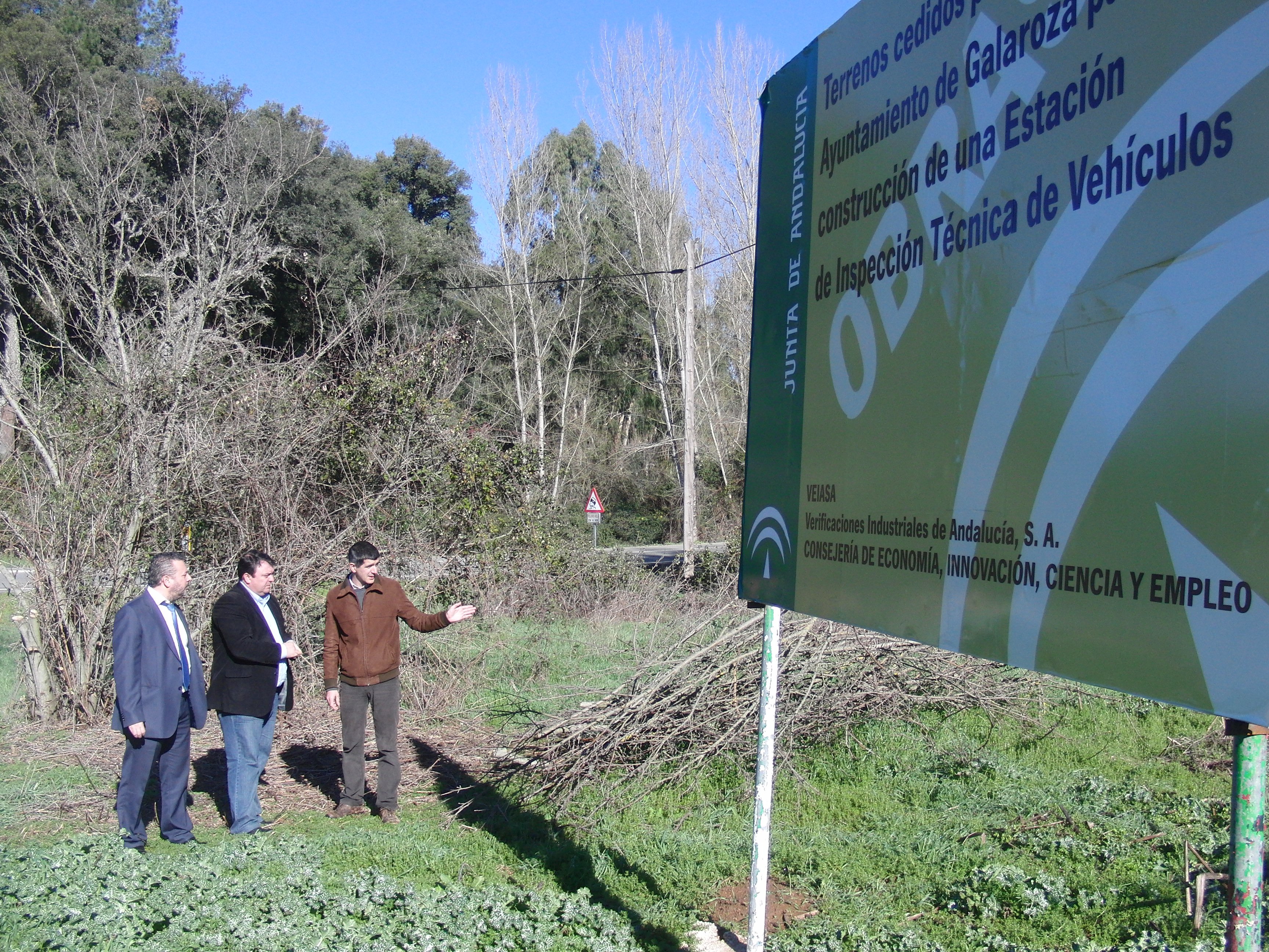 El delegado territorial de Economía, Innovación, Ciencia y Empleo, Eduardo Muñoz, visita en Galaroza los terrenos donde se ubicará la nueva estación de Inspección Técnica de Vehículos (ITV) que prestará servicio en la Sierra onubense. Está acompañado por el alcalde de la localidad, Antonio Sosa, y por el jefe de Área en la provincia de la empresa pública de Verificaciones Industriales de Andalucía SA, Jesús Peral.