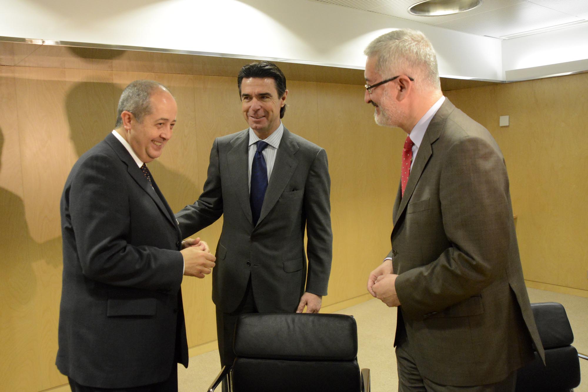 El consejero de Economía, Antonio Ávila, saluda al ministro de Industria, José Manuel Soria, y al consejero de Empresa de Cataluña, Felip Puig, antes de la Conferencia sectorial de Energía celebrada en Madrid.