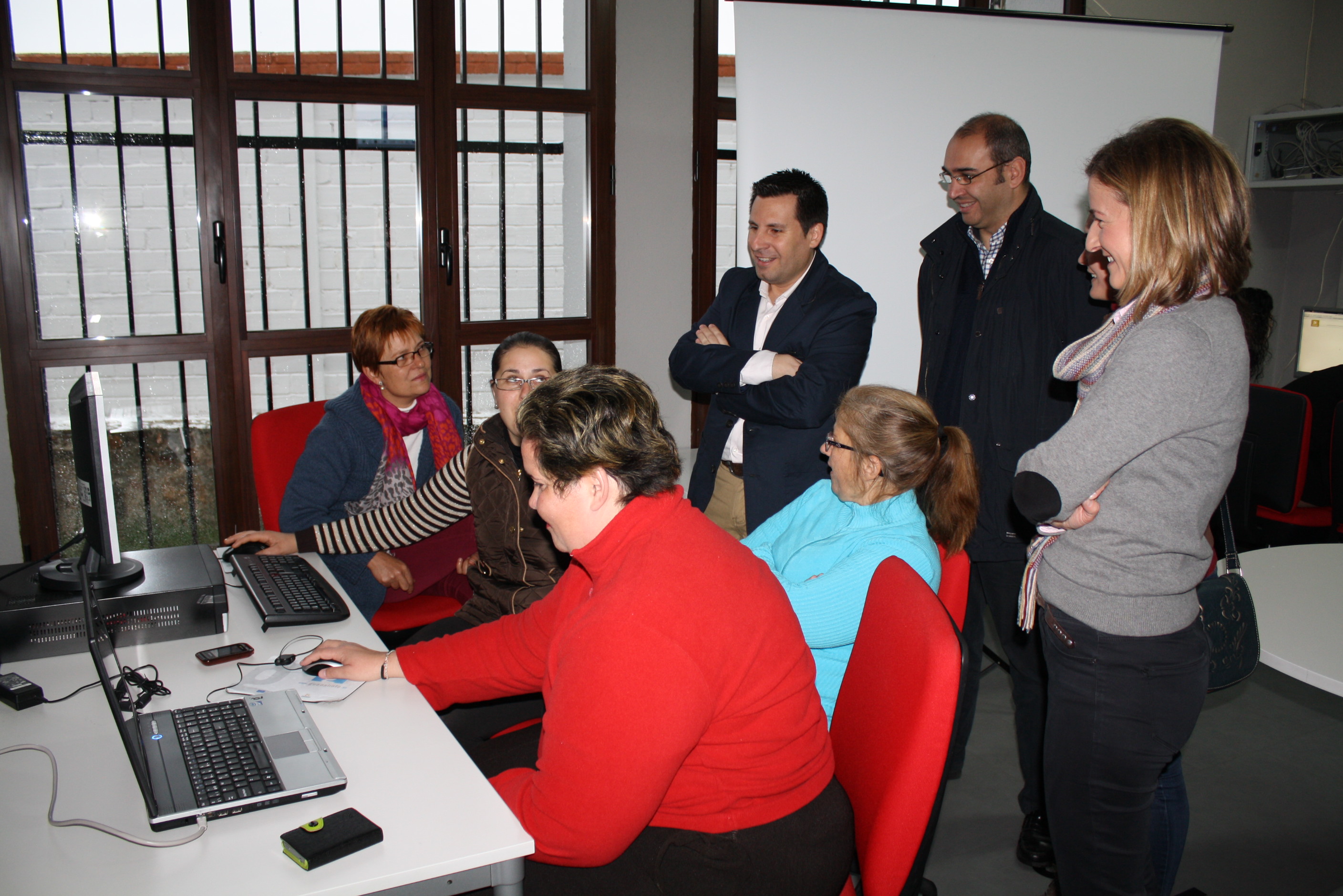 Al fondo de pie, el delegado de Economía. Innovación, Ciencia y Empleo, José Ignacio Expósito, escuchando las explicaciones de las usuarias del Guadalinfo de Conquista.