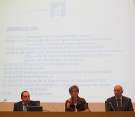 La delegada territorial de Economía, Innovación, Ciencia y Empleo, junto al director general del PITA y el jefe del Servicio de Cooperación Económica y Desarrollo Tec-nológico de la Delegación Territorial, en el encuentro de trabajo de la red Guadalinfo en el PITA.