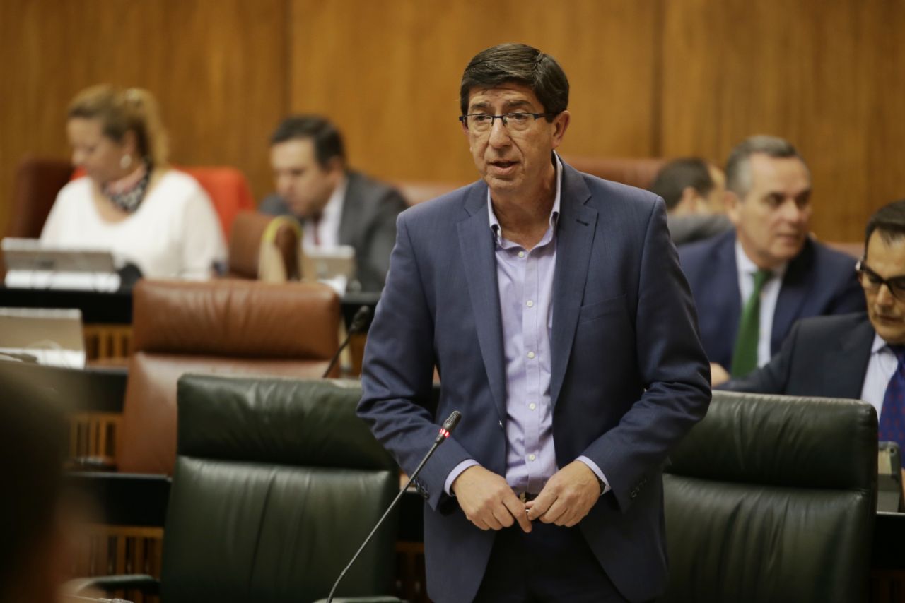 El vicepresidente y consejero, Jaun Marín, en la sesión de hoy en el Parlamento de Andalucía